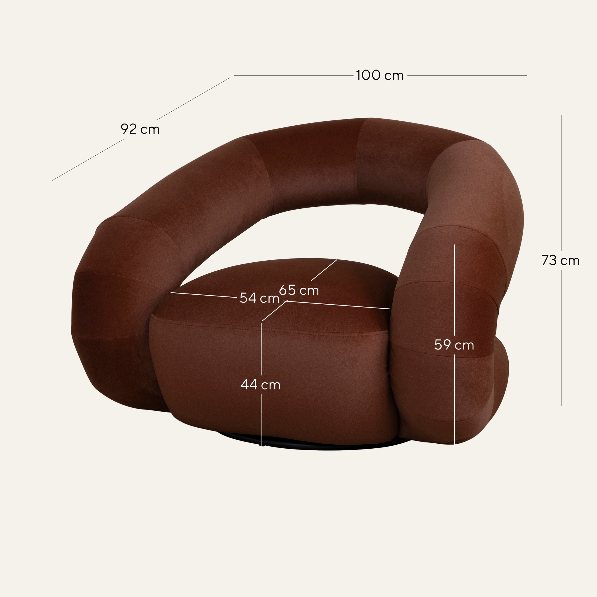 Overall: 100cm (W) x 92cm (D) x 73cm (H) Seat: 54cm (W) x 65cm (D) x 44cm (H) Arm Height: 59cm Leg Height: 4cm