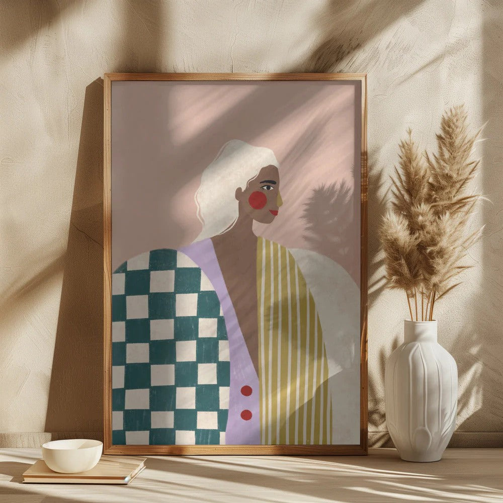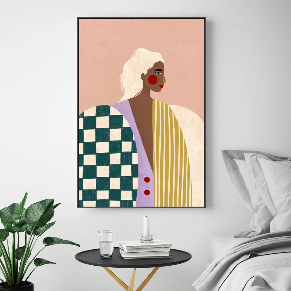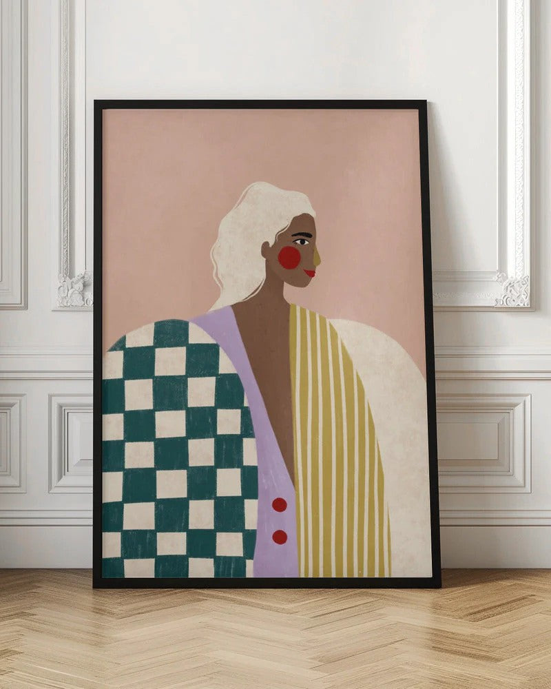 Bold contemporary portrait featuring graphic patterns and vibrant colour blocking. Checkered and striped elements contrast against soft blush tones. Framed and ready to hang - perfect for adding artistic personality to modern interiors.