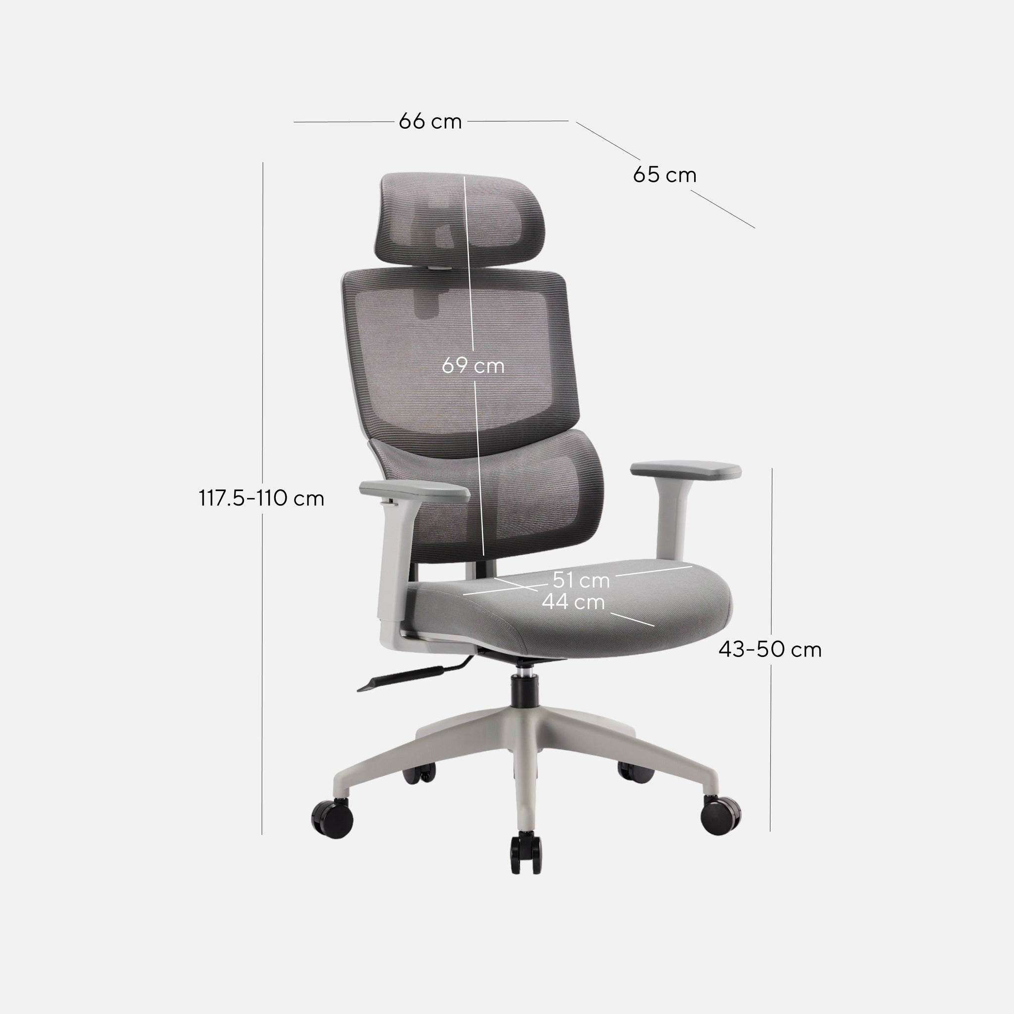 Overall: 66cm (W) x 65cm (D) x 110-117.5cm (H) Seat: 51cm (W) x 44cm (D) x 43-50cm (H) Backrest Height: 69cm