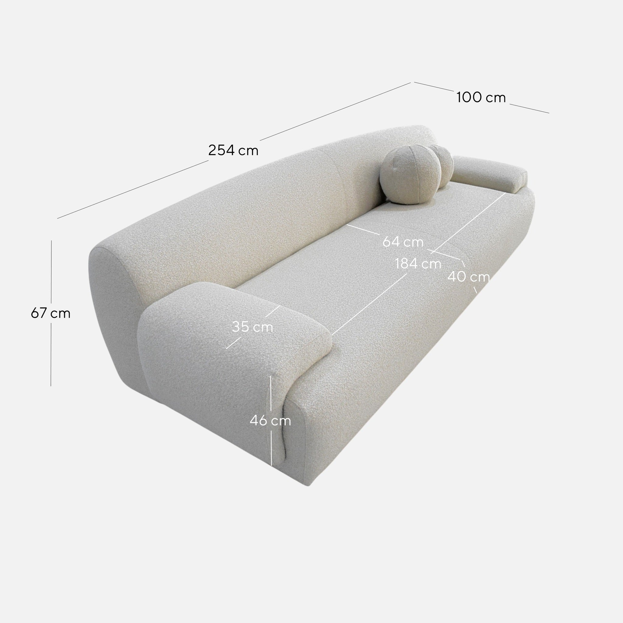 Overall: 254cm (W) x 100cm (D) x 67cm (H) Seat: 184cm (W) x 64cm (D) x 40cm (H) Arm Height: 46cm Leg Height: 4cm