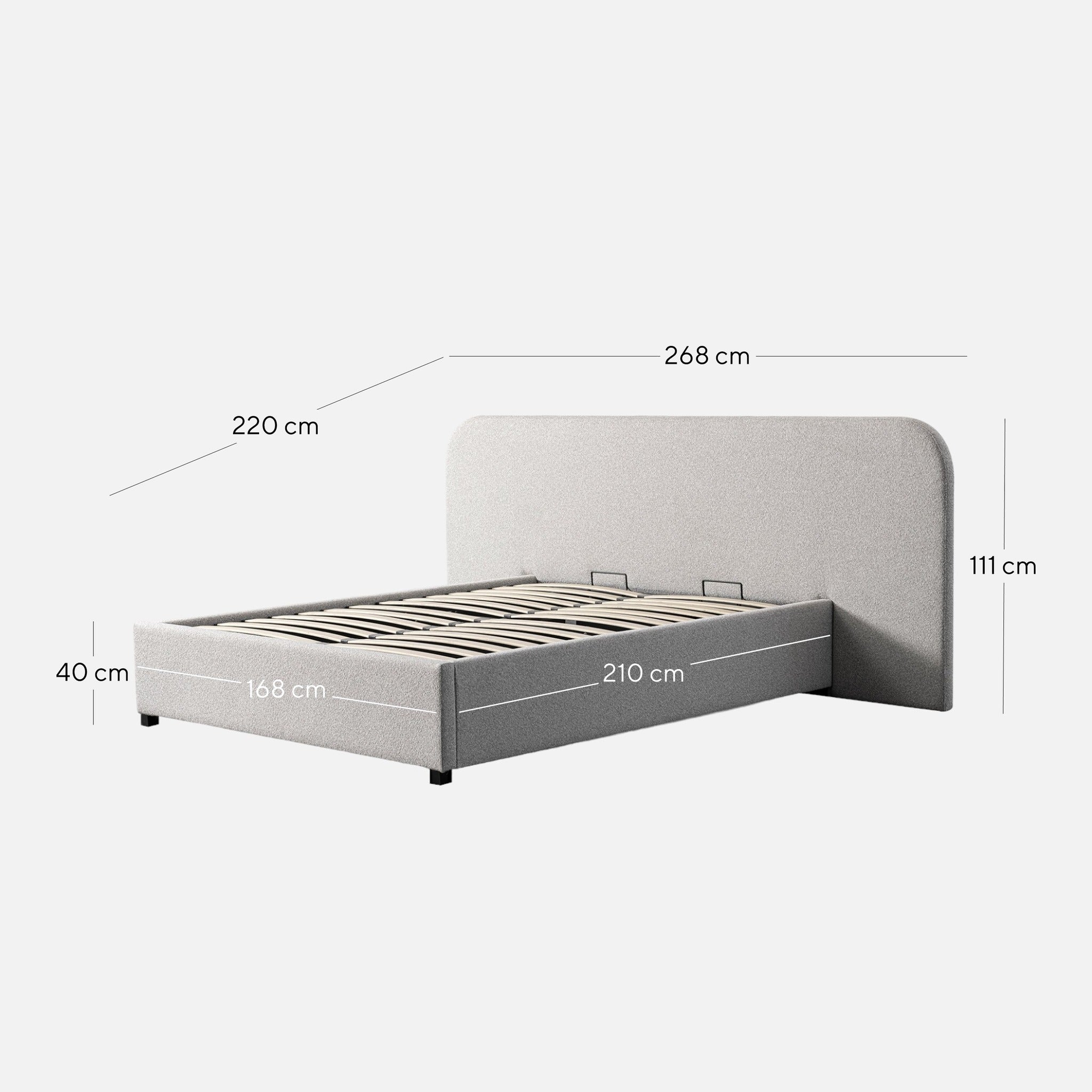Overall: 268cm (W) x 220cm (D) x 111cm (H) Headboard: 268cm (W) x 10cm (D) x 111cm (H) Bedside Frame 168cm (W) x 210cm (D) x 40cm (H) Leg Height: 5cm