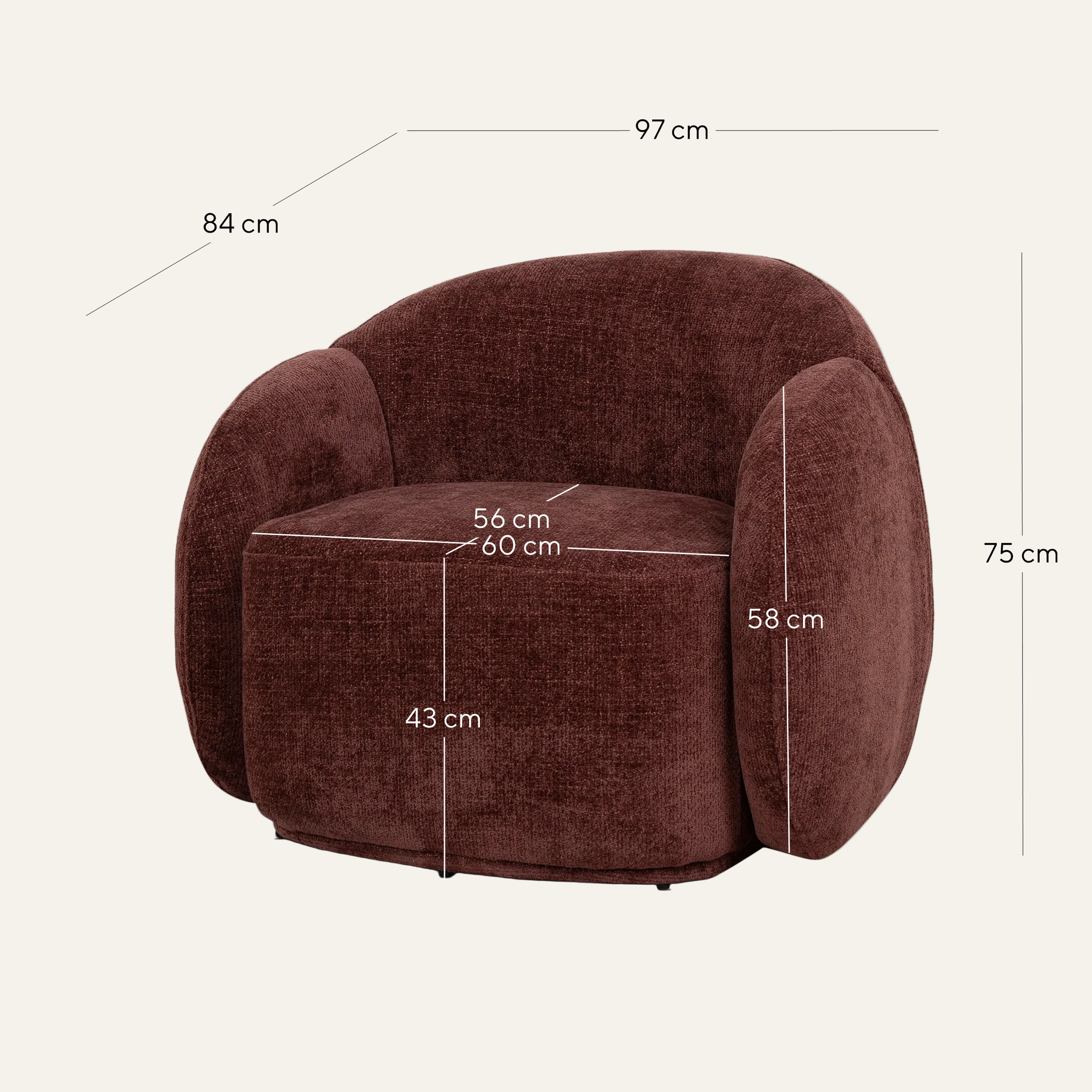 Overall: 97cm (W) x 84cm (D) x 75cm (H) Seat: 60cm (W) x 56cm (D) x 43cm (H) Arm Height: 58cm