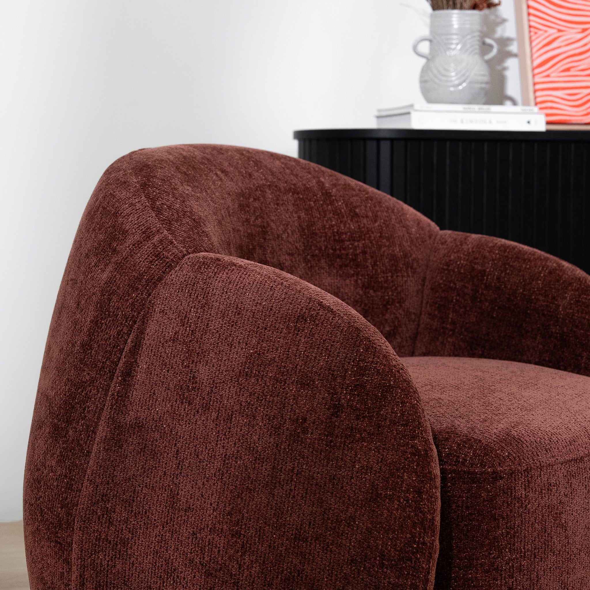 Confident and expressive, the Haldor Armchair in Lila Burgundy makes an instant impact with its full-bodied shape and grounded stance. The deep burgundy tone adds richness and mood, turning it into a focal point rather than just a lounge seat.