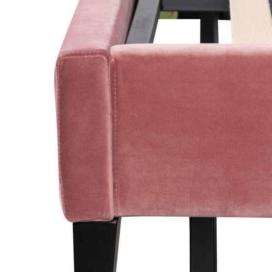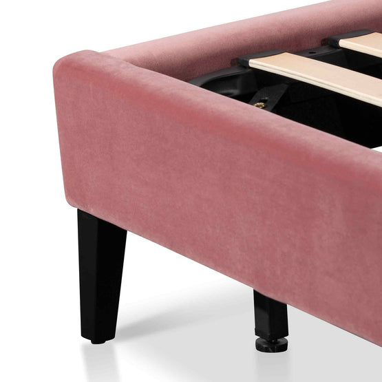 - Frame and headboard upholstered in 100% polyester velvet with blush peach finish