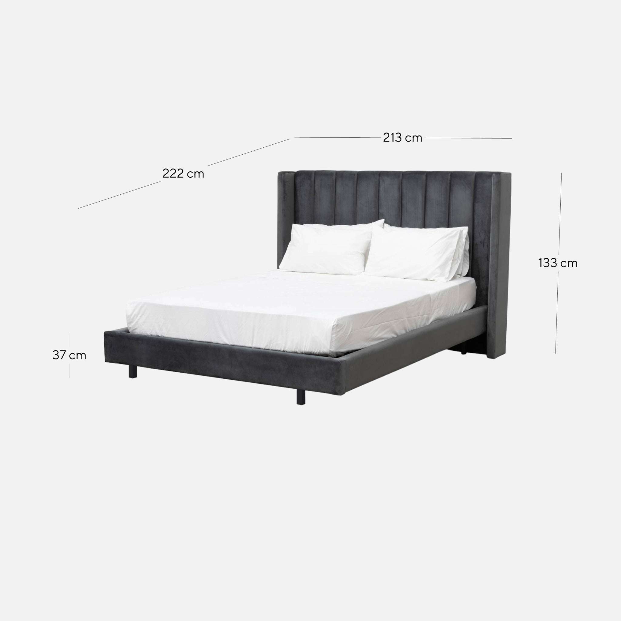 - Frame and bed head upholstered in 100% charcoal polyester velvet