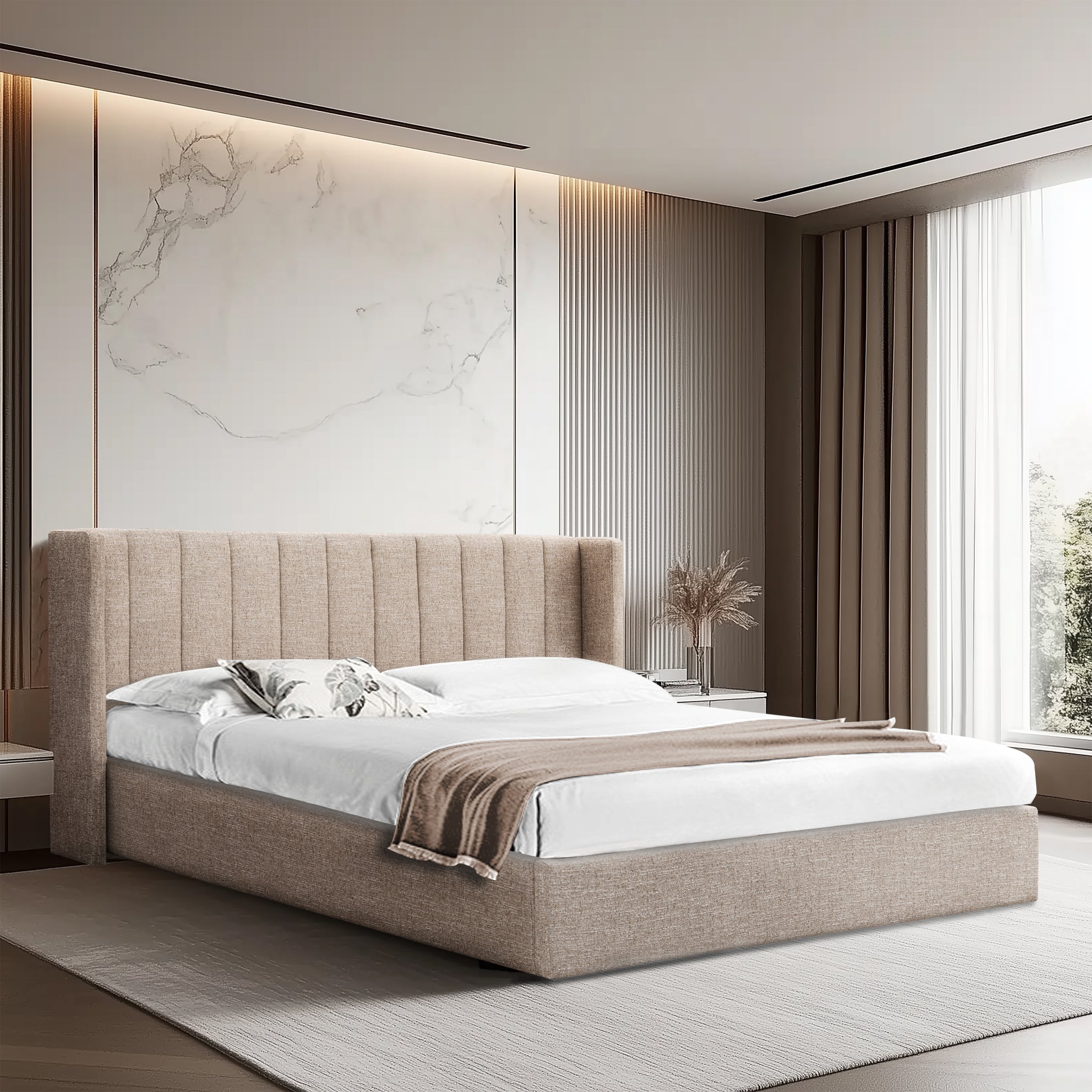 - Wide vertical panel tufting on the headboard