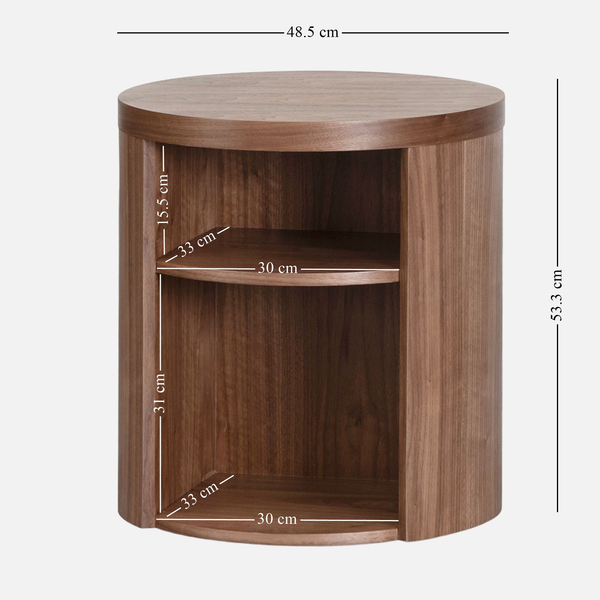 Overall: 48.5cm (D) x 53.3cm (H) Upper Shelf: 30cm (W) x 33cm (D) x 15.5cm (H) Bottom Shelf: 30cm (W) x 33cm (D) x 31cm (H)