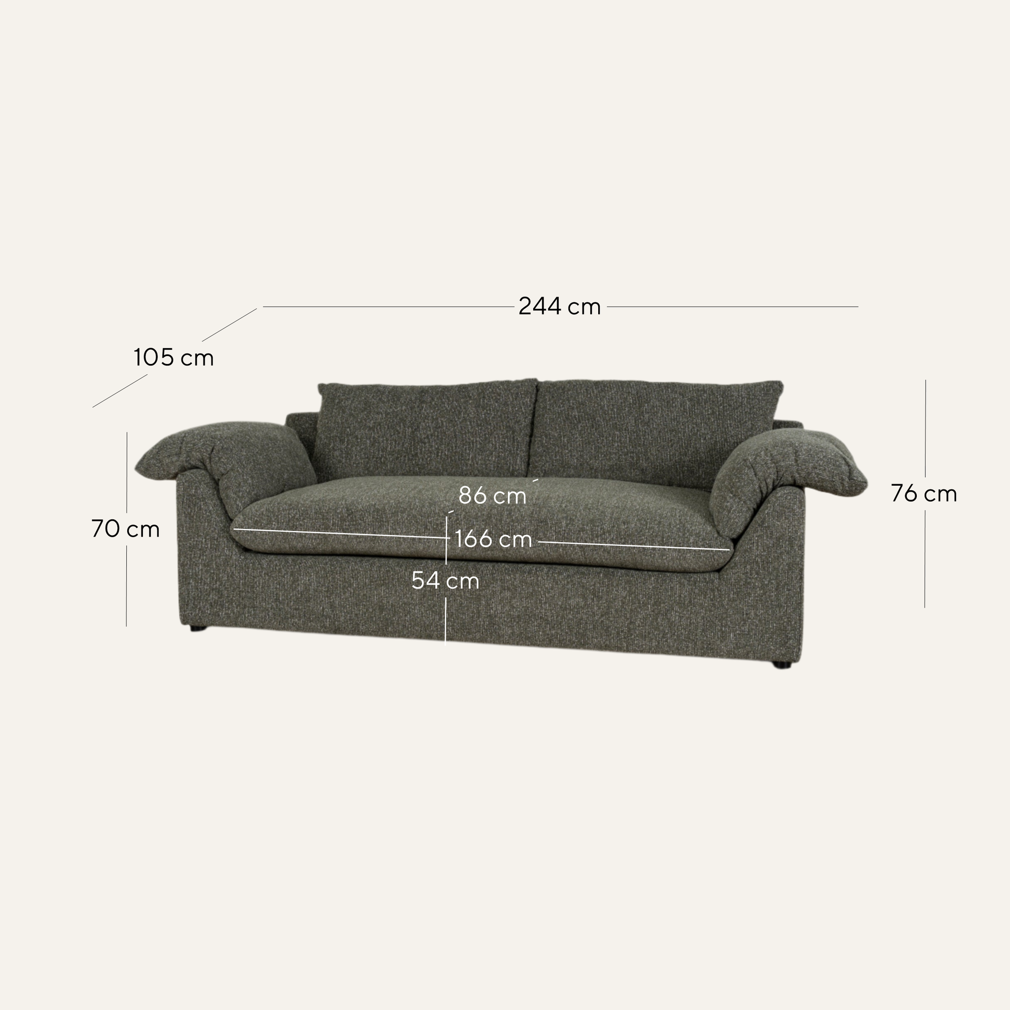 Overall: 244cm (W) x 105cm (D) x 76cm (H) Seat: 166cm (W) x 86cm(D) x 54cm (H) Arm Height: 70cm Leg Height: 3cm