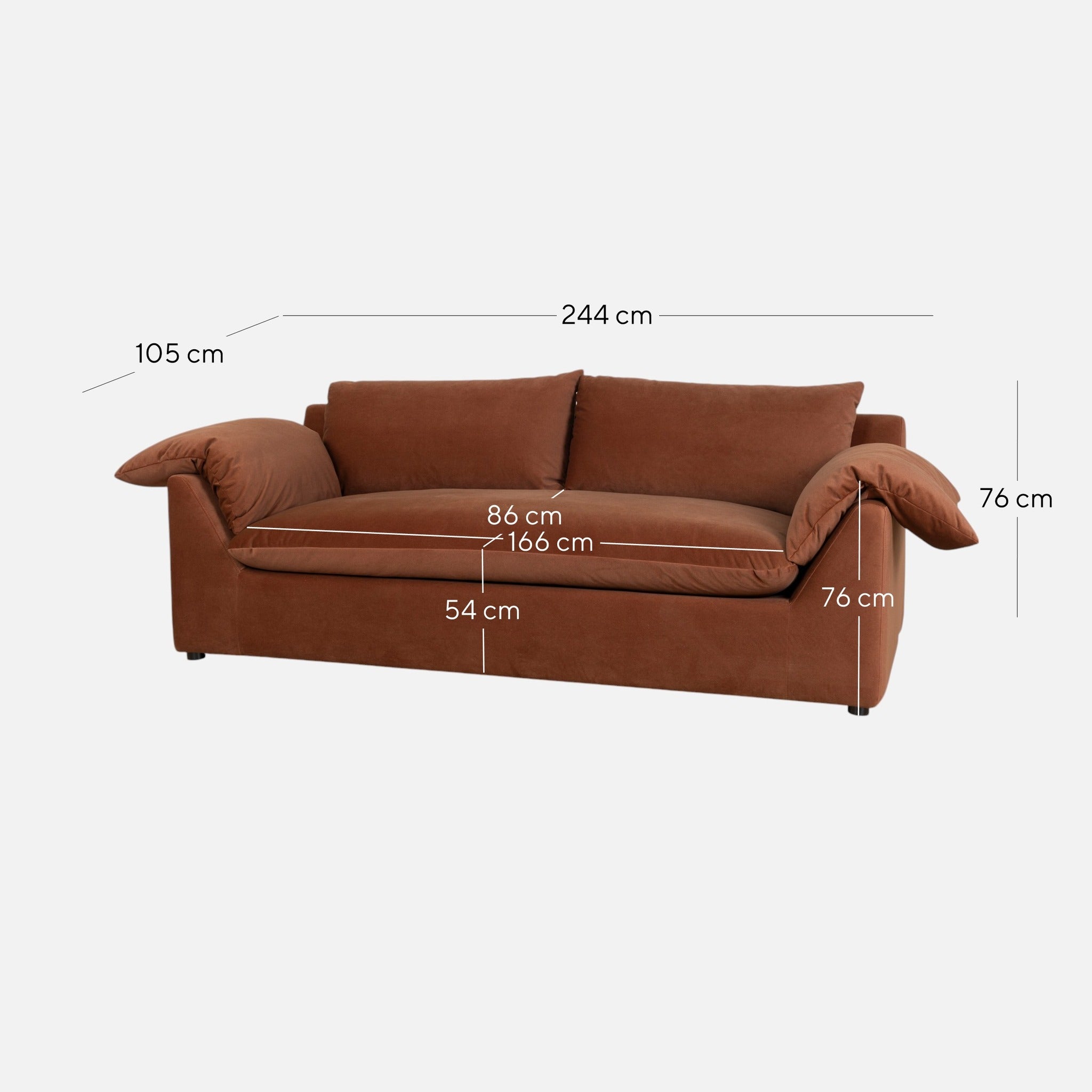 Overall: 244cm (W) x 105cm (D) x 76cm (H) Seat: 166cm (W) x 86cm (D) x 54cm (H) Arm Height: 70cm Leg Height: 3cm