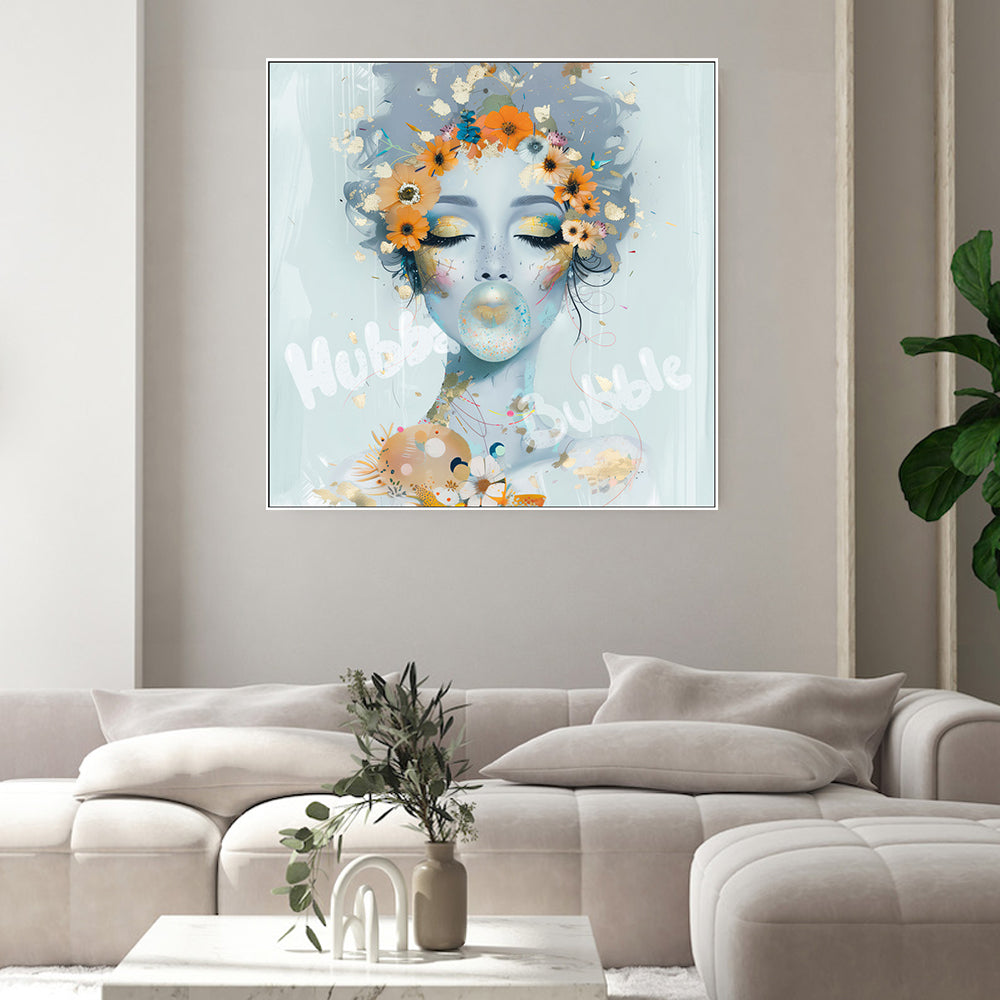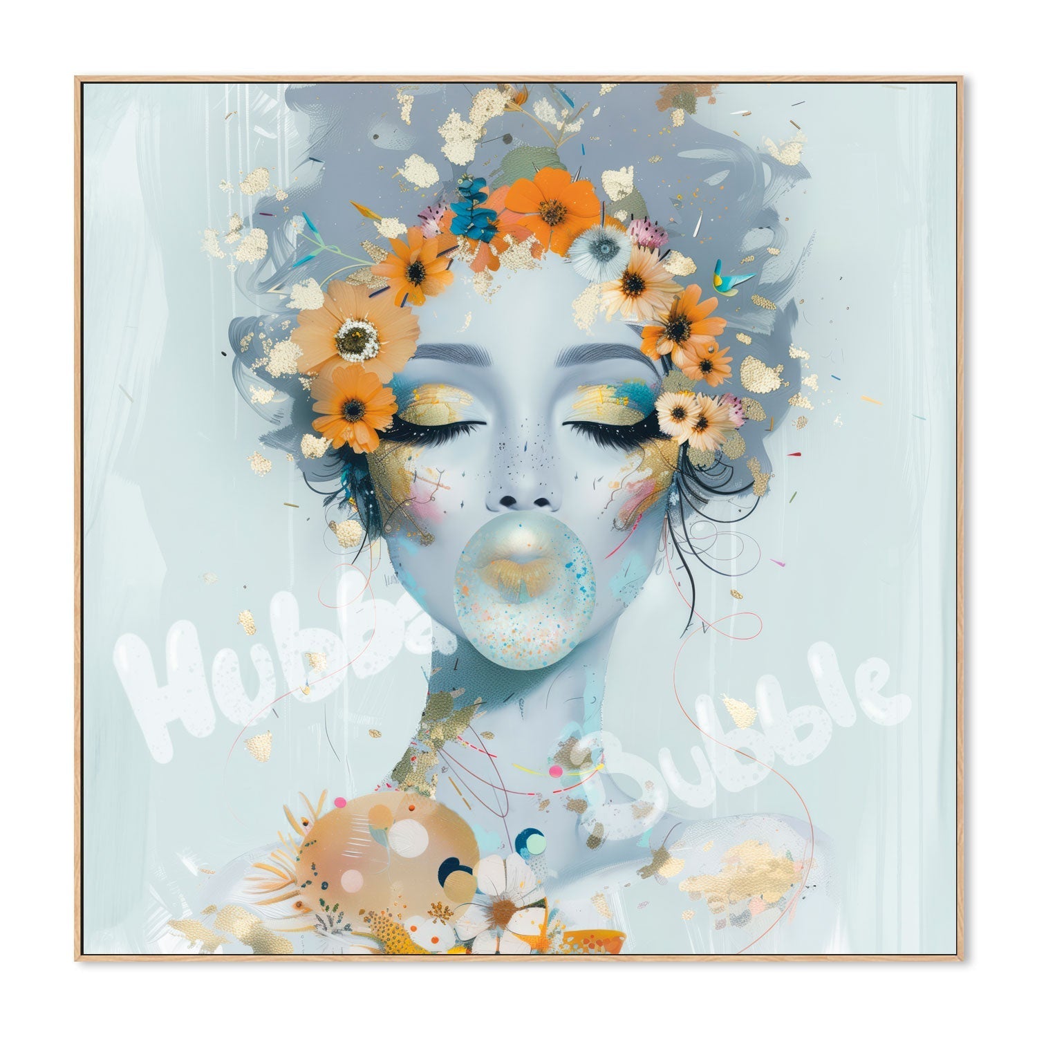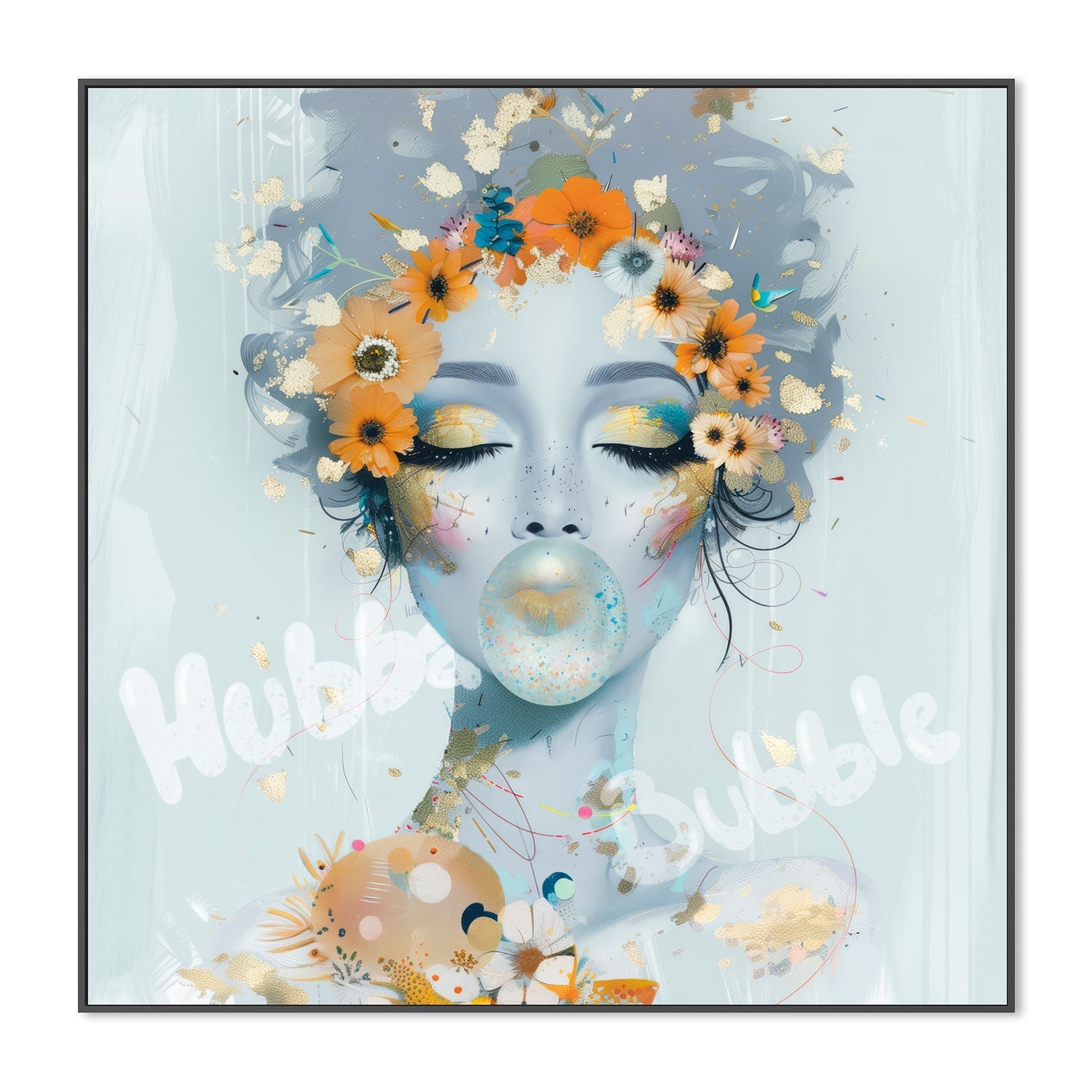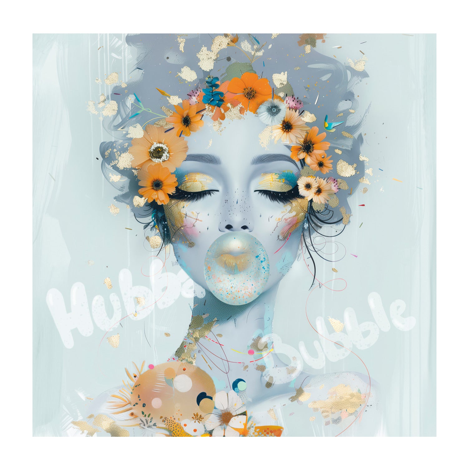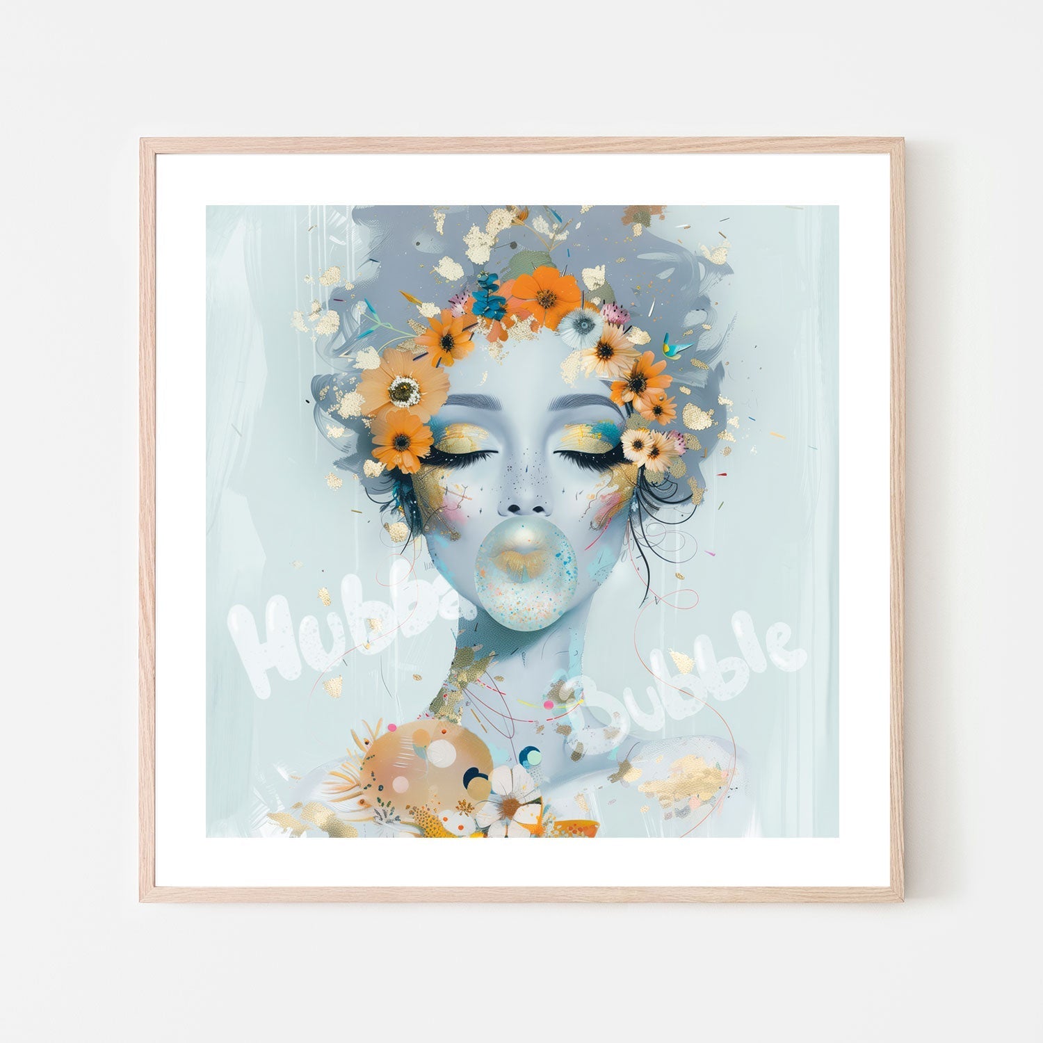 Indulge in a burst of joy with Hubba Bubble, the quirky and playful creation by Bella Eve. A whimsical woman adorned with flowers blows a bubble, evoking a carefree and wonderous feeling. Bring vibrant colors and a playful atmosphere to your space with this delightful illustration.
