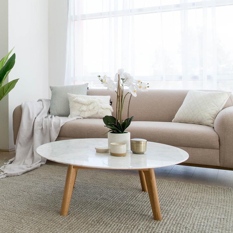 Stylish and elegant looking Hunter 100cm Round coffee table is harmonious combination of Scandinavian silhouette, warm timber tones and modern marble materials. Constructed with Solid oak legs and frame & Polished Carrara marble top with lacquered finish for superior structural support and timeless style