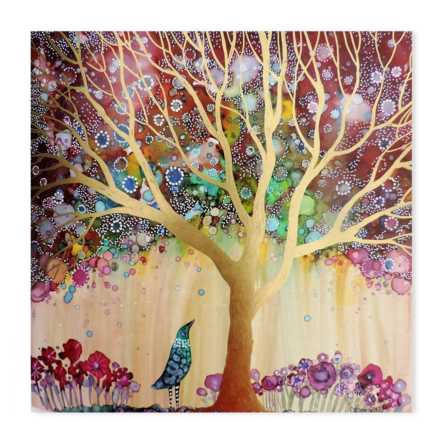 Add a touch of magic with I Am Strength by Sylvie Demers. This vibrant, dreamlike artwork features a whimsical tree, golden branches, and a curious bird. Bring warmth, depth, and inspiration to your walls with this unique piece.