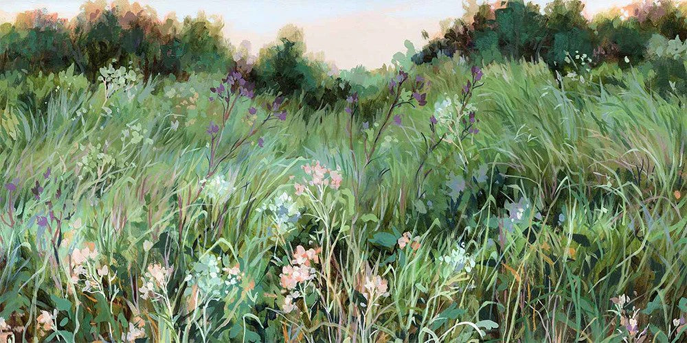 I'll Stay by Jennifer L Mohr depicts a tranquil meadow with soft grasses and wildflowers. Layered brushstrokes in gentle greens create a serene landscape. Framed and ready to hang, it brings calm and natural beauty to any space.