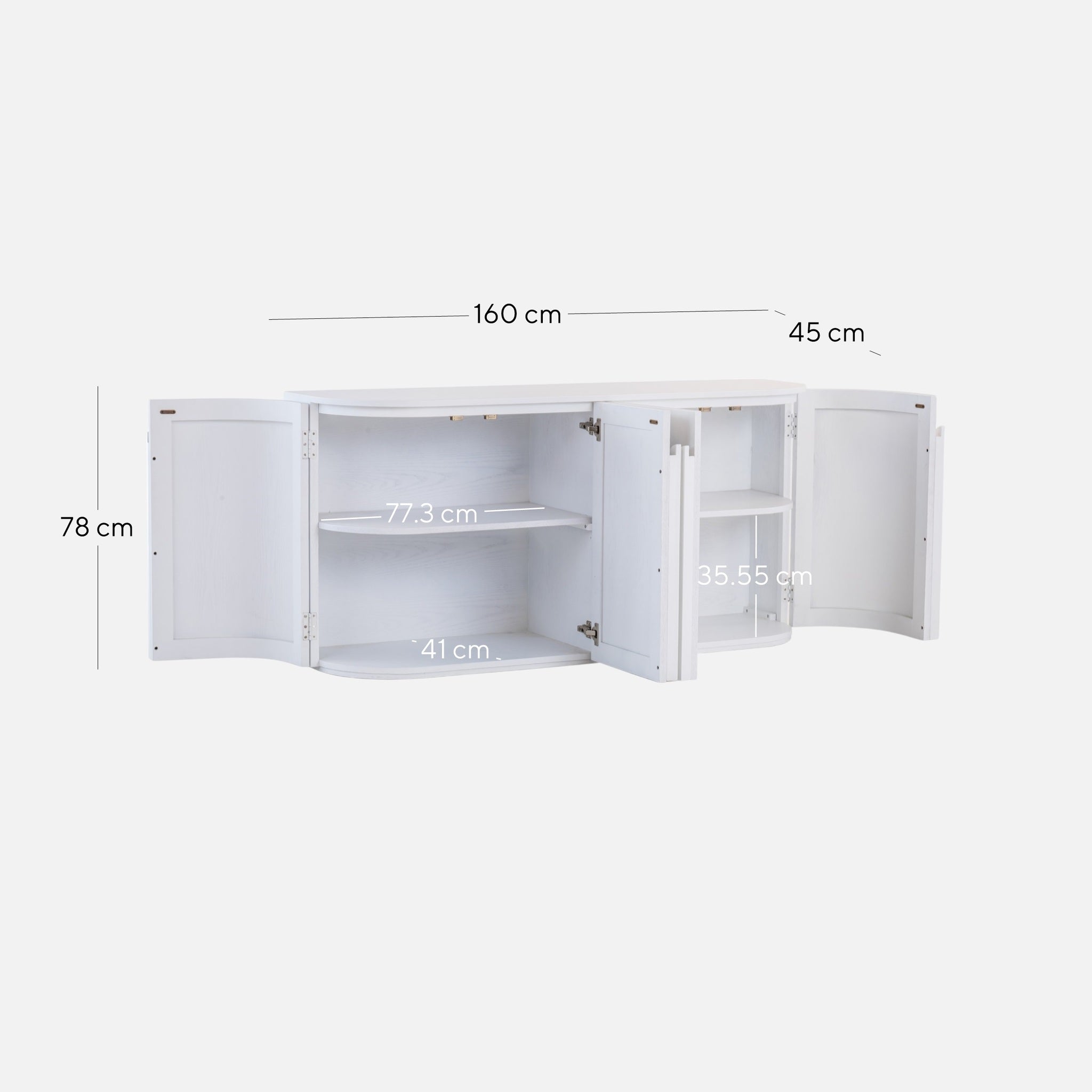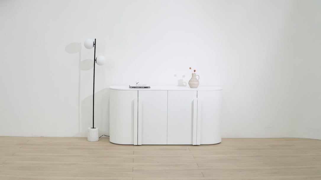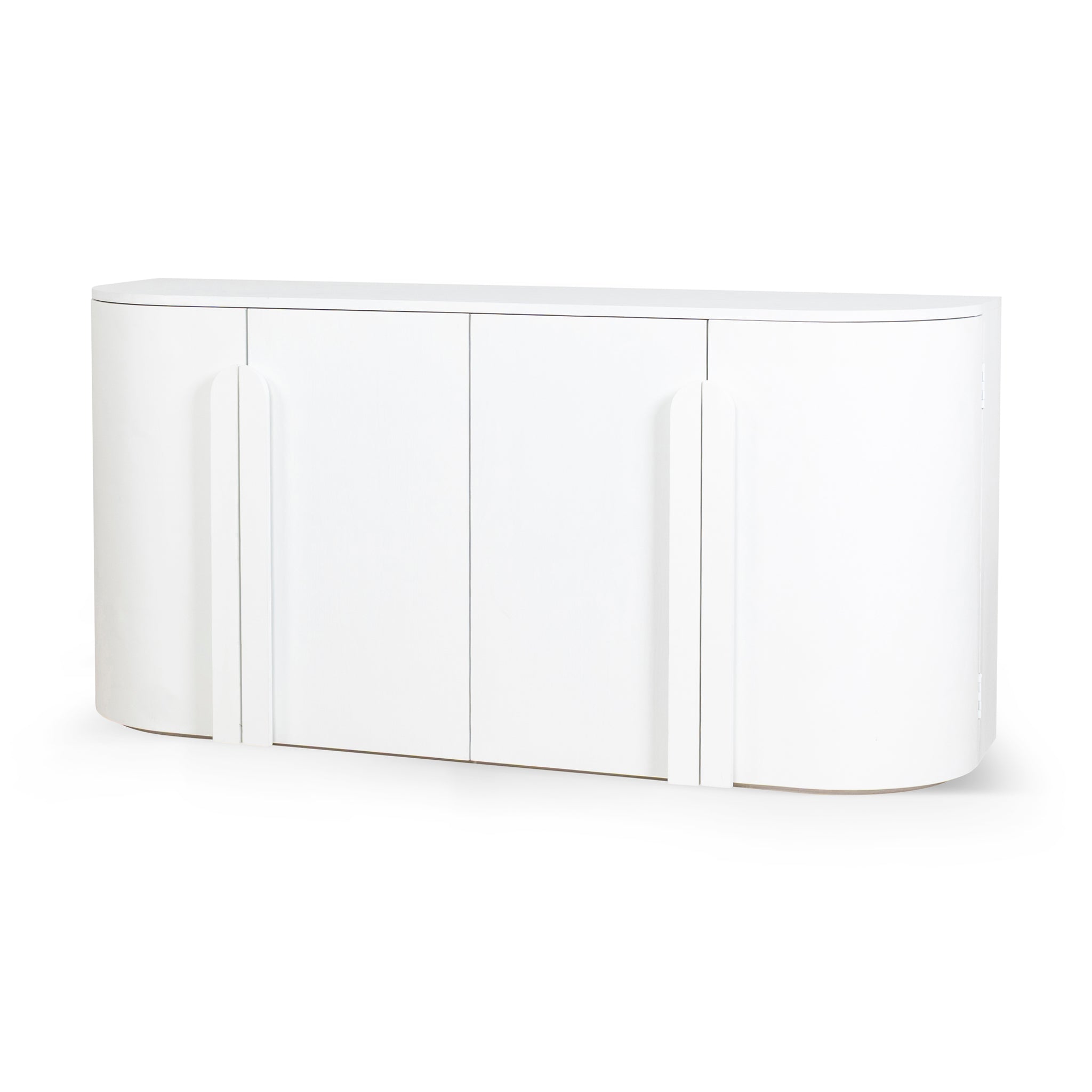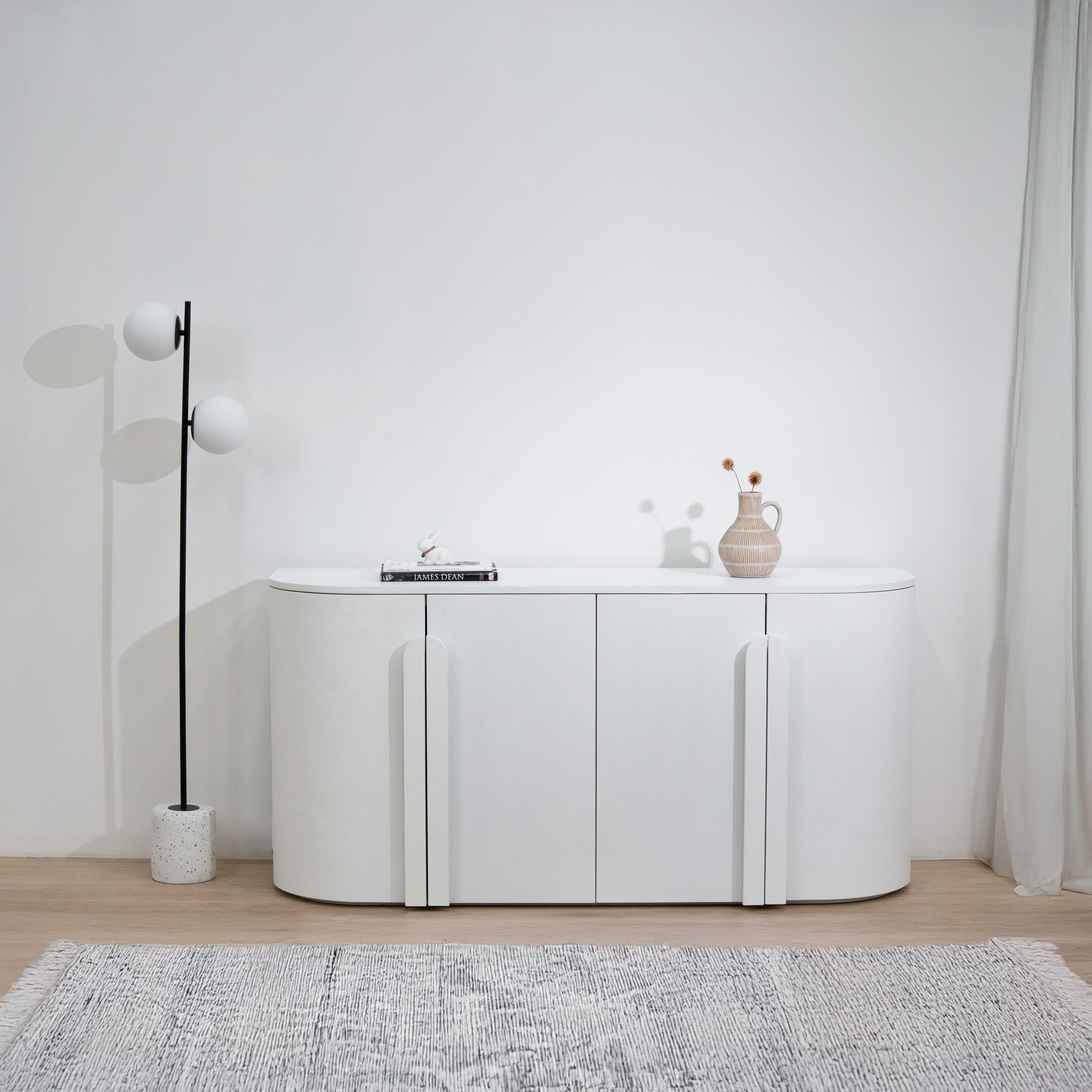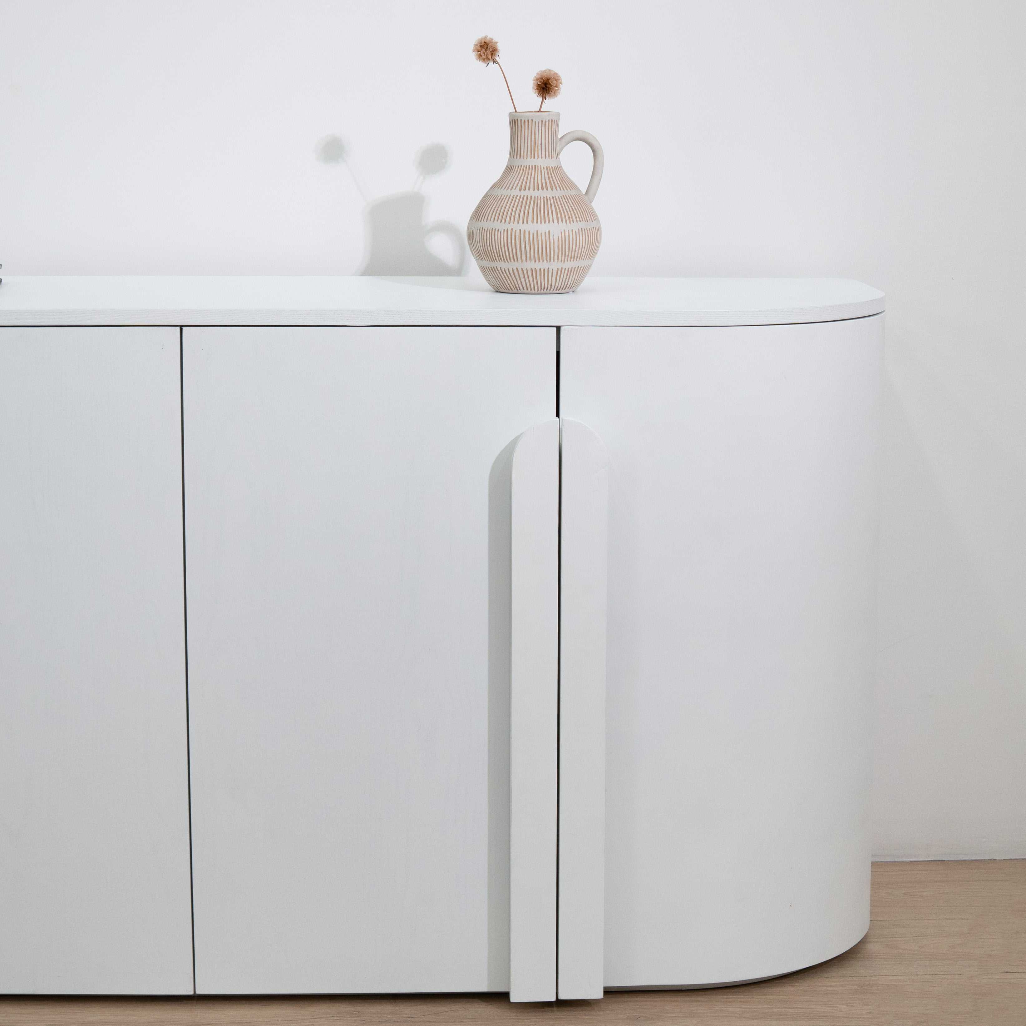 Elevate your space with the bold and stylish Jarrett 1.6m Sideboard in full white. Its curved design breaks away from the traditional rectangular shape, adding a touch of fluidity and sophistication to any room.