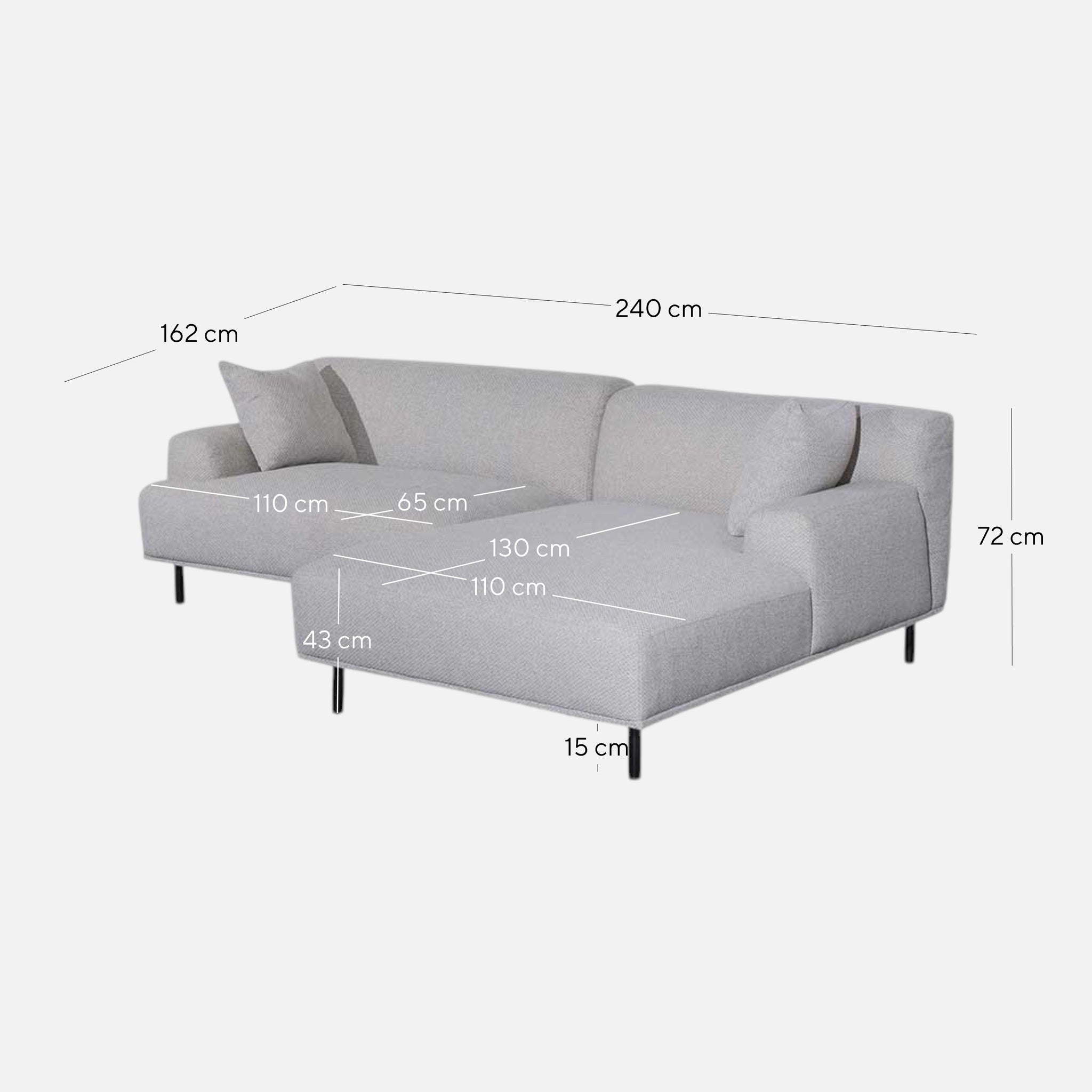 Overall: 240cm (W) x 162cm (D) x 72cm (H)Arm Height from Floor: 56cmLeg Height: 15cmChaiseOverall: 110cm (W) x 162cm (D) x 72cmSeat: 130cm (D) x 43cm (H)SofaOverall: 130cm (W) x 96cm (D) x 72cmSeat: 65cm (D) x 43cm (H)