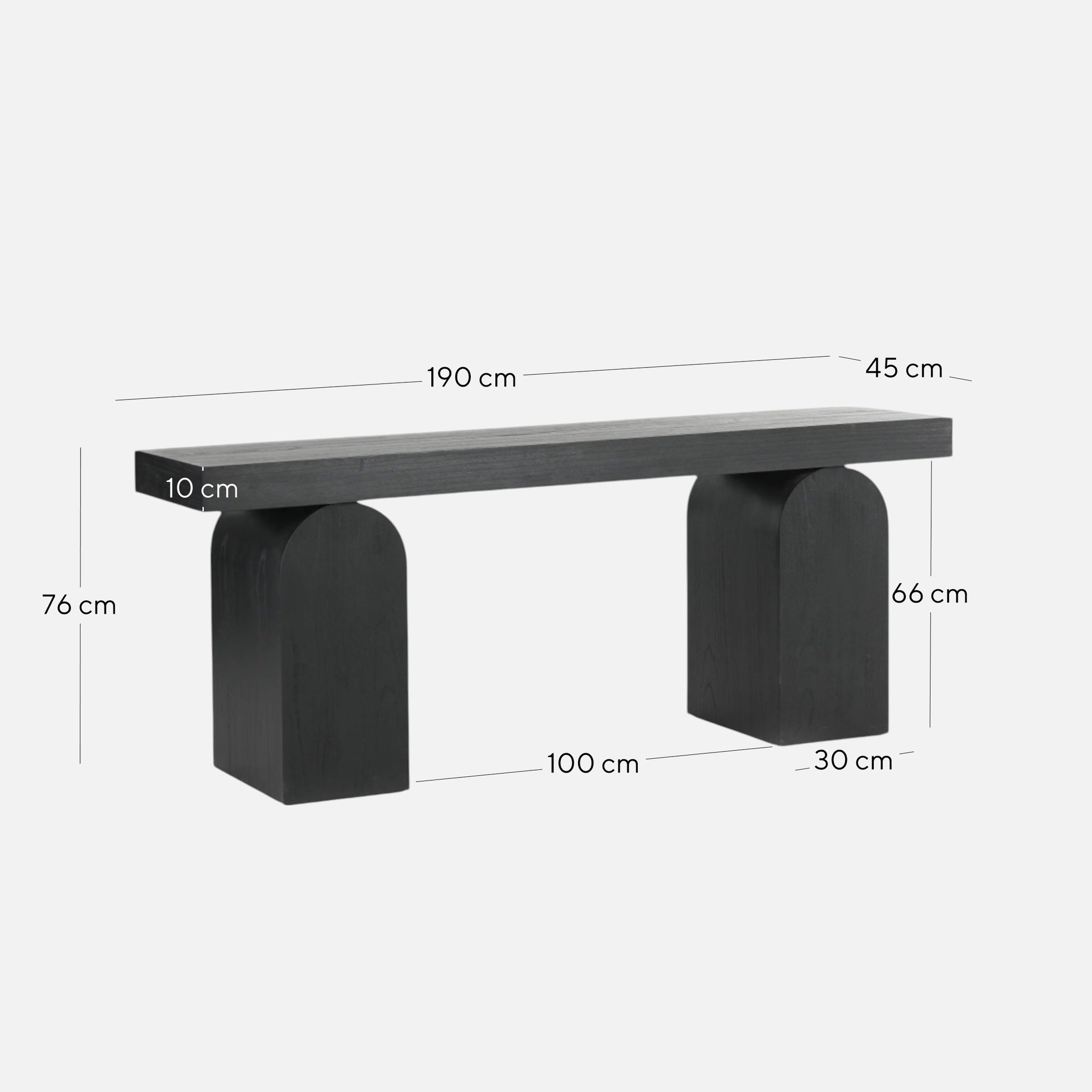 Overall: 190cm (W) x 45cm (D) x 76cm (H) Table Thickness: 10cm Table Hanging: 15cm Leg: 30cm (W) x 66cm (H) Distance between Legs: 100cm
