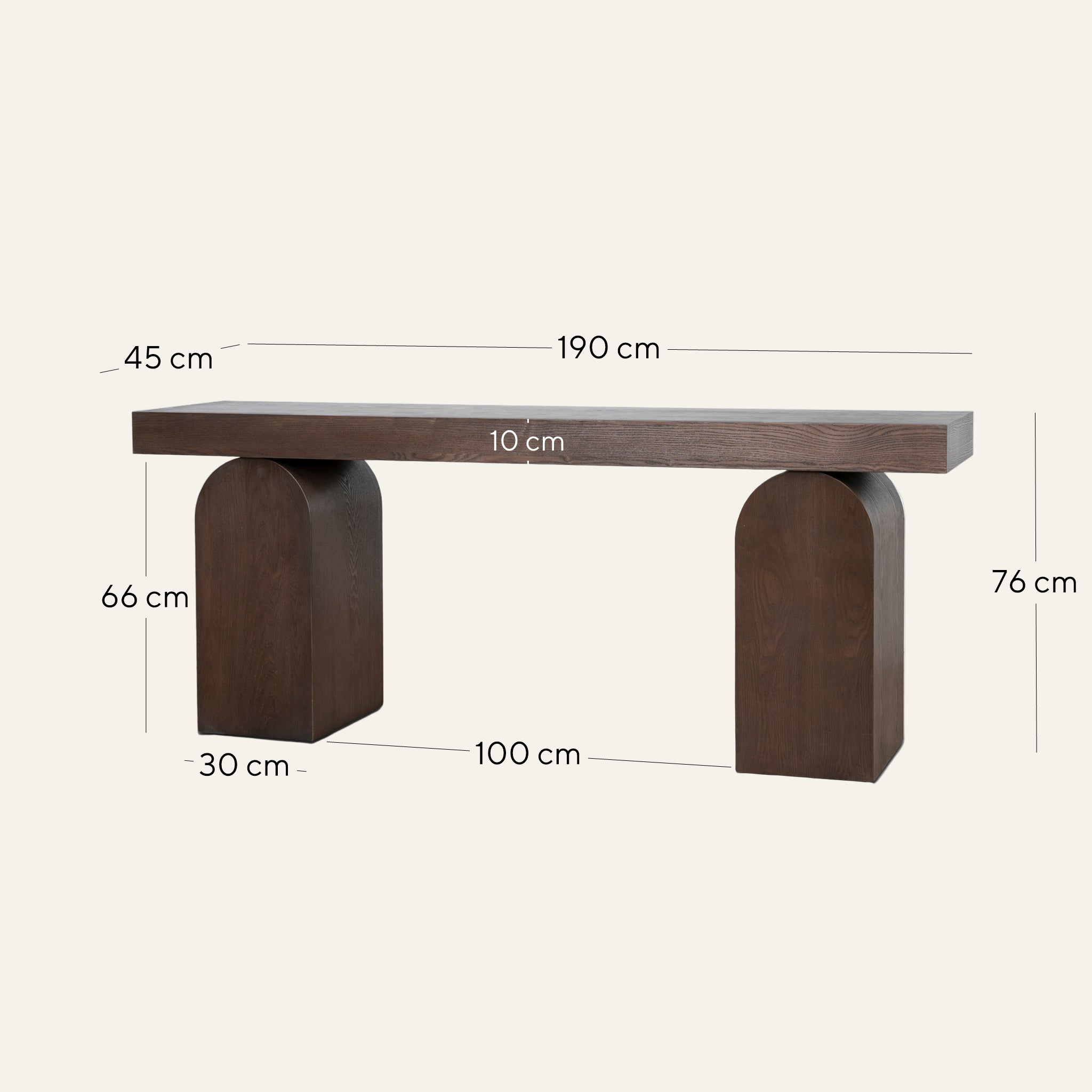 Bringing sculptural elegance to modern interiors, The Junon 1.9m New Elm Console Table in Walnut features a bold architectural silhouette with rounded pedestal bases that rise into smooth, arched curves supporting a clean, elongated tabletop.
