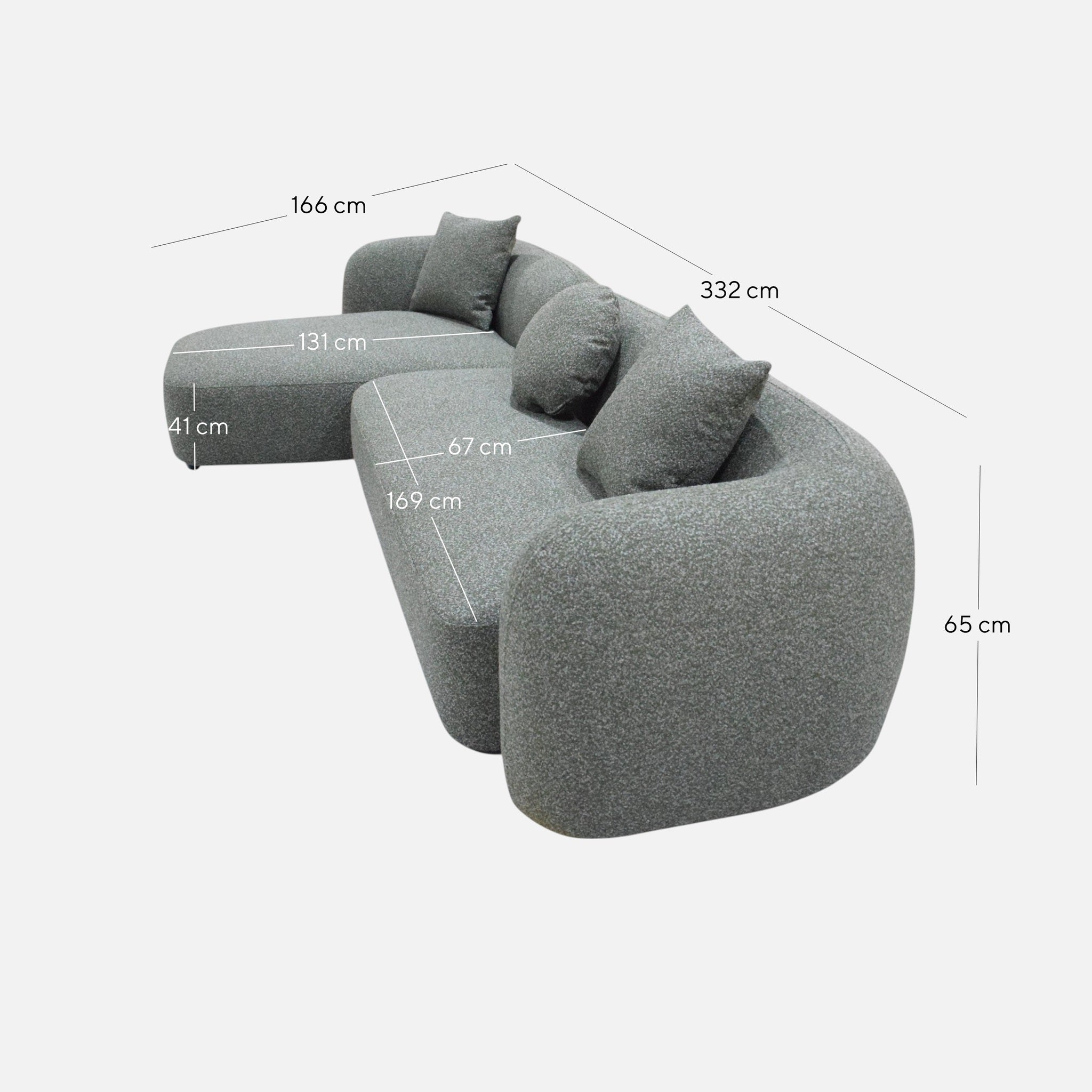 Overall: 332cm (W) x 166cm (D) x 65cm (H) Arm Height: 65cm Leg Height: 4cm Sofa Section: 204cm (W) x 102cm (D) x 65cm (H) Seat: 169cm (W) x 67cm (D) x 41cm (H) Chaise Section: 128cm (W) x 166cm (D) x 65cm (H) Seat: 93cm (W) x 131cm (D) x 41cm (H)