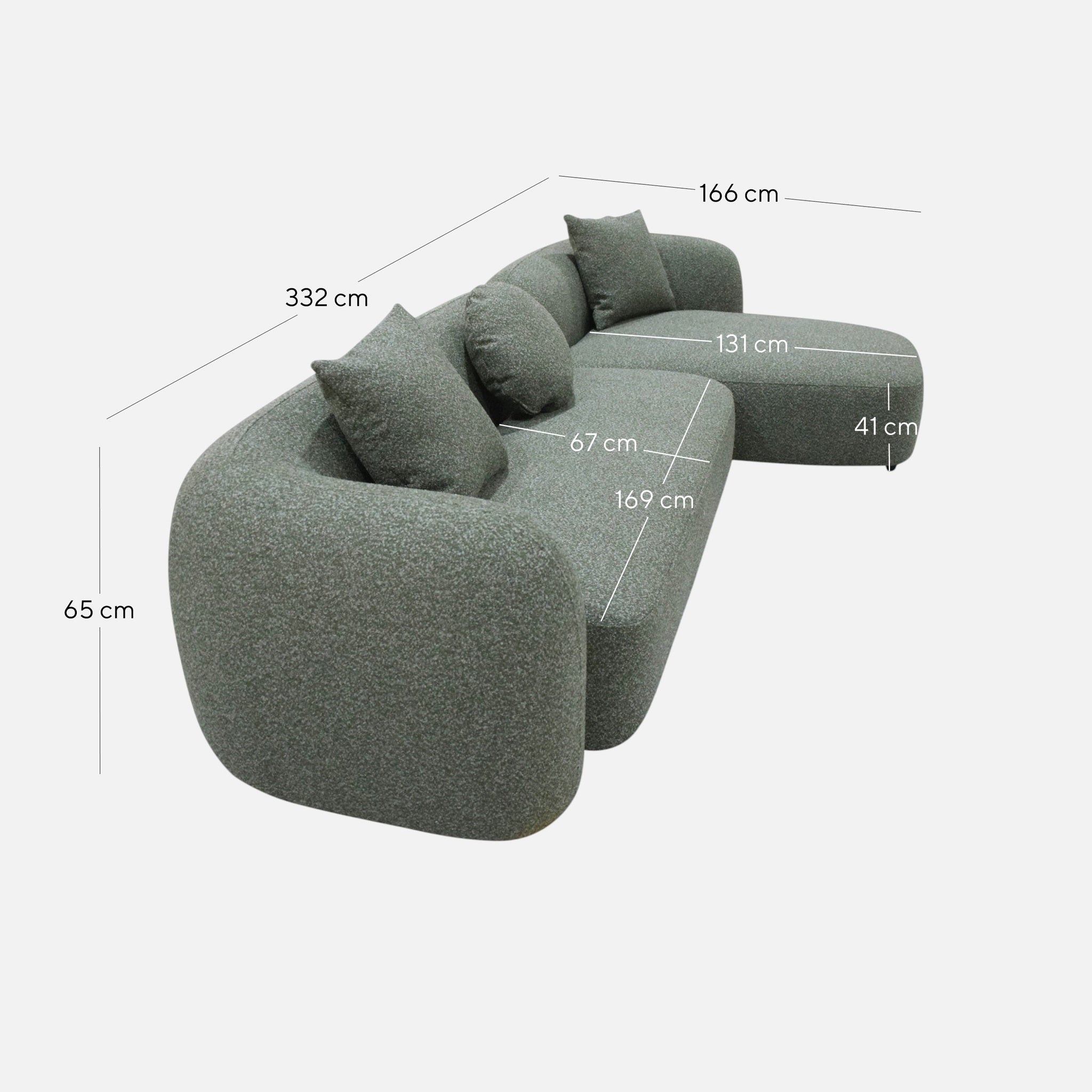Overall: 332cm (W) x 166cm (D) x 65cm (H) Arm Height: 65cm Leg Height: 4cm Sofa Section: 204cm (W) x 102cm (D) x 65cm (H) Seat: 169cm (W) x 67cm (D) x 41cm (H) Chaise Section: 128cm (W) x 166cm (D) x 65cm (H) Seat: 93cm (W) x 131cm (D) x 41cm (H)