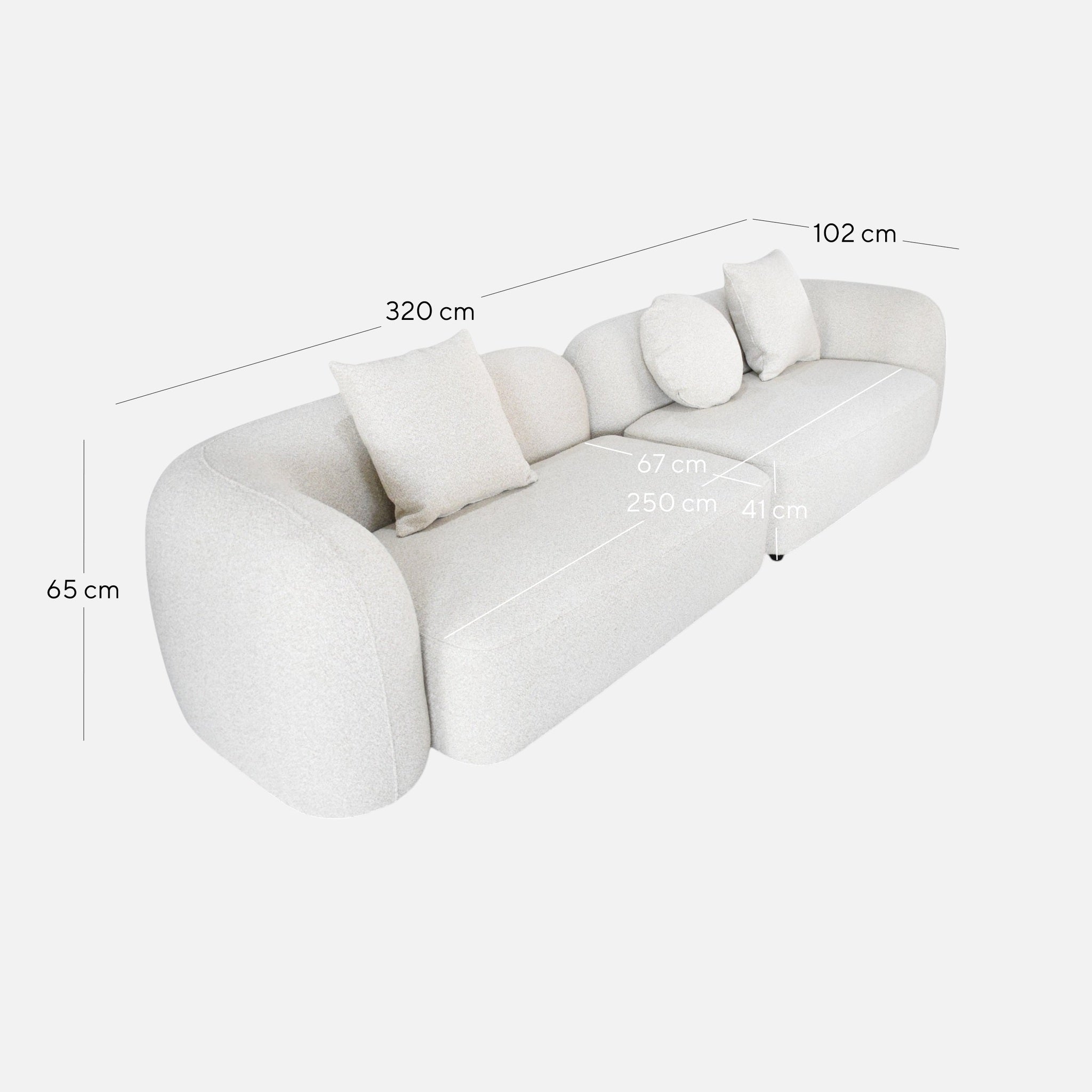Overall: 320cm (W) x 102cm (D) x 65cm (H) Seat: 250cm (W) x 67cm (D) x 41cm (H) Arm Height: 65cm Leg Height: 4cm