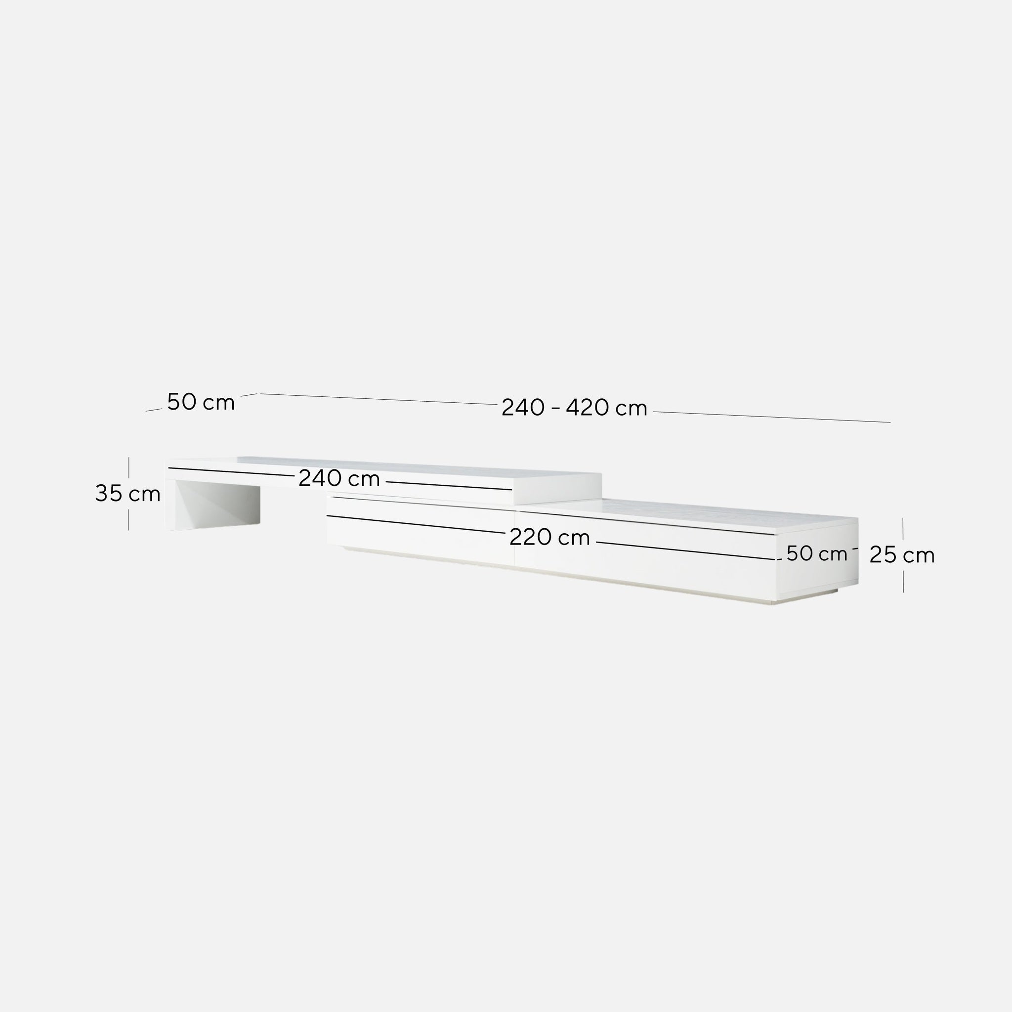 Overall: 240cm - 420cm (W) x 50cm (D) x 35cm (H)Extension Panel: 240cm (W) x 50cm (D) x 35cm (H)Drawer: 220cm (W) x 50cm (D) x 25cm (H)