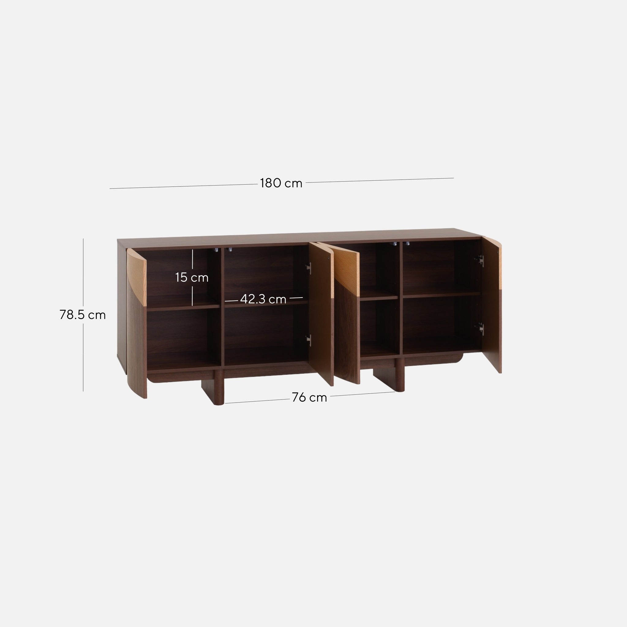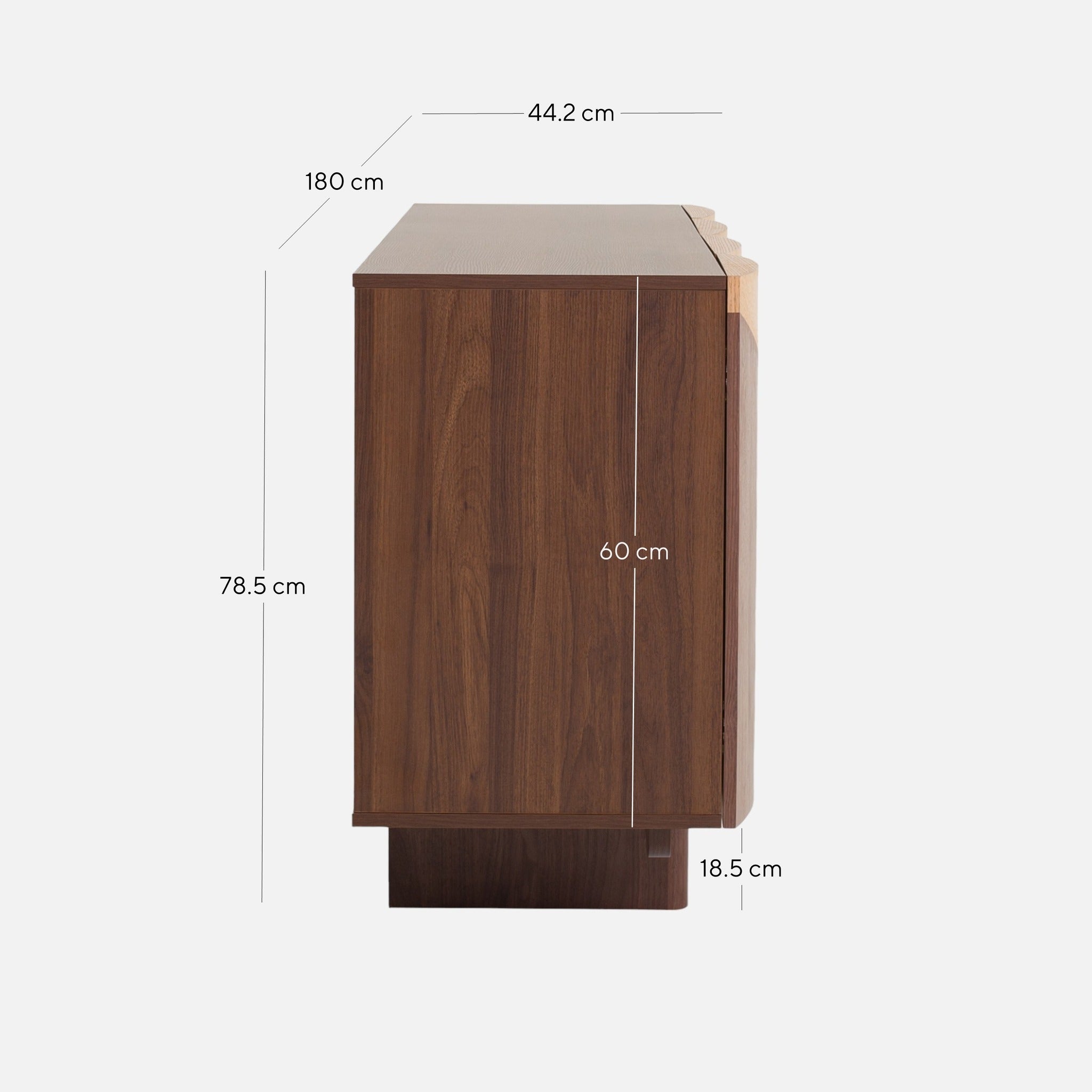 The most distinctive feature of the Kerstin 1.8m Sideboard is its geometric pattern on the doors. This design element adds a modern and artistic touch to the piece, making it a focal point in any room. The contrast between the walnut veneer and the oak veneer creates a dynamic visual effect.