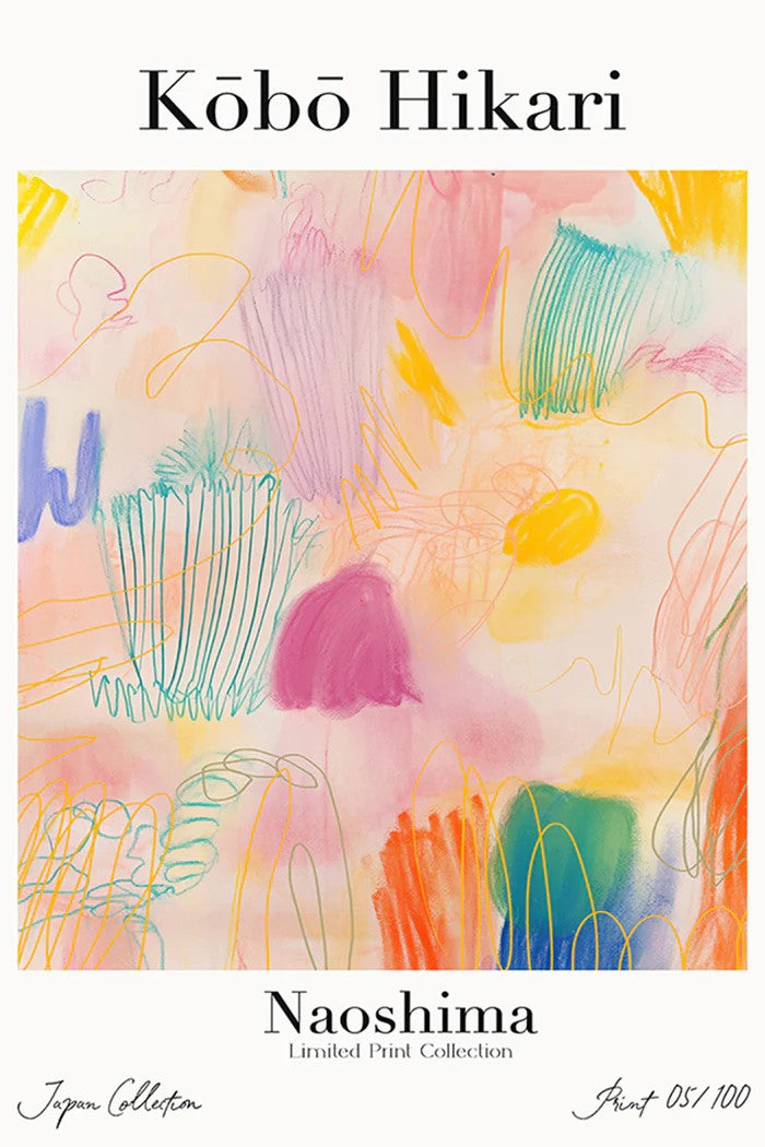 Kobohikari No. 39 by Treechild brings contemporary artistry to your space. This vibrant abstract piece from the Naoshima Limited Print Collection features playful linework and soft pastels with striking colour accents. Pre-framed and ready to hang, it's an instant statement for modern interiors.
