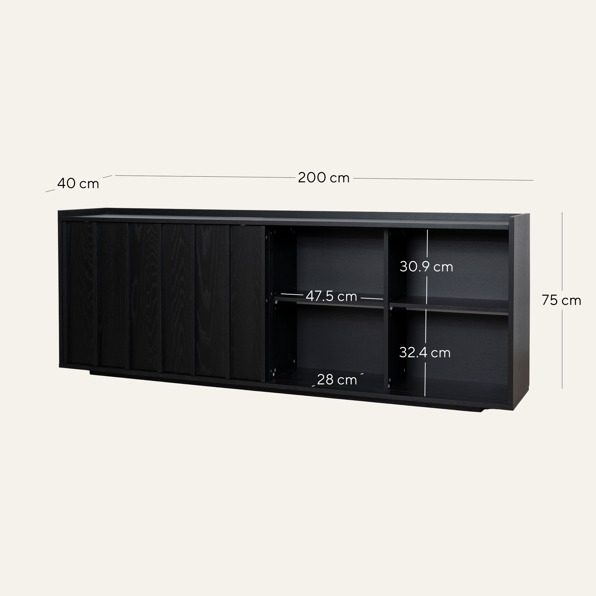What sets the Kobus 2m Sideboard Unit in Full Black apart is its strong architectural character, subtle vertical paneling adds rhythm and texture to its exterior, giving it an understated yet commanding presence. The solid block design rests slightly elevated, balancing its sturdy profile with a sense of lightness and refinement.