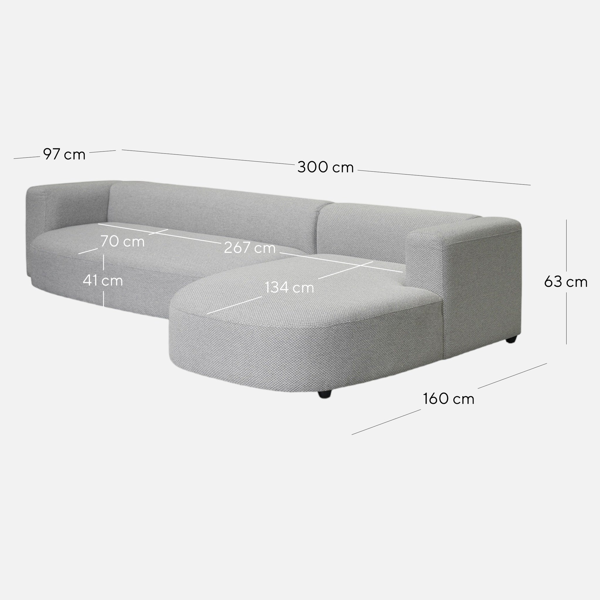 Overall: 300cm (W) x 160/97cm (D) x 63cm (H) Seat: 267cm (W) x 70/134cm (D) x 41cm (H) Arm Height: 63cm