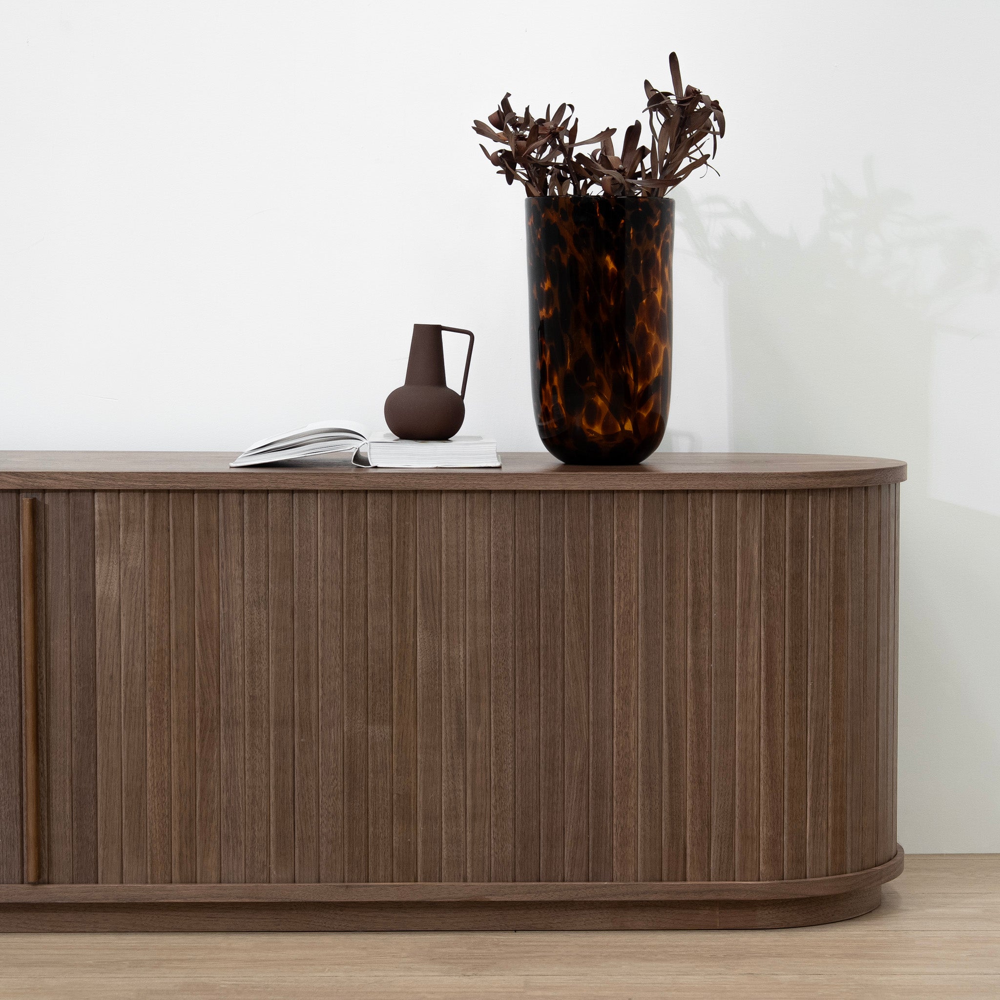 Elongated proportions and softly rounded edges give the Linea TV Entertainment Unit in Walnut a fluid, grounded presence. Its low-profile design enhances openness, while a warm walnut finish and integrated storage balance display and organisation within a clean, cohesive silhouette.