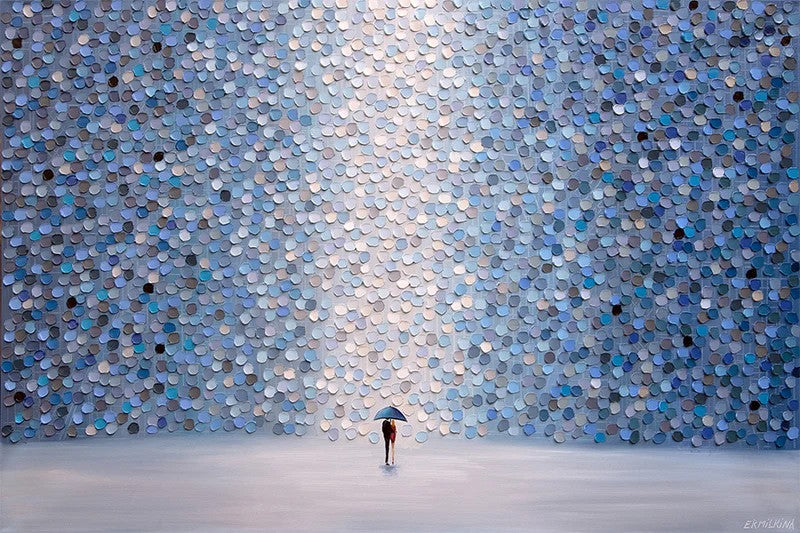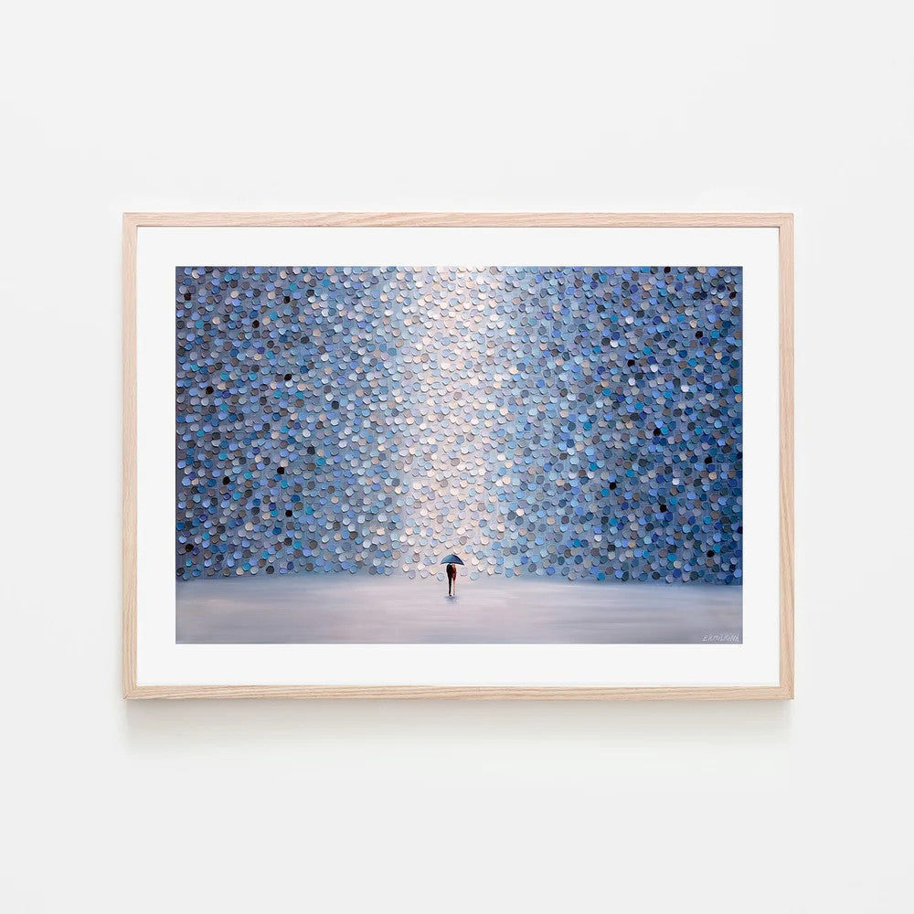 A solitary figure shelters beneath cascading blue circles in this romantic artwork by Ekaterina Ermilkina. Framed and ready to hang, it brings contemporary charm and intimate softness to any interior space.