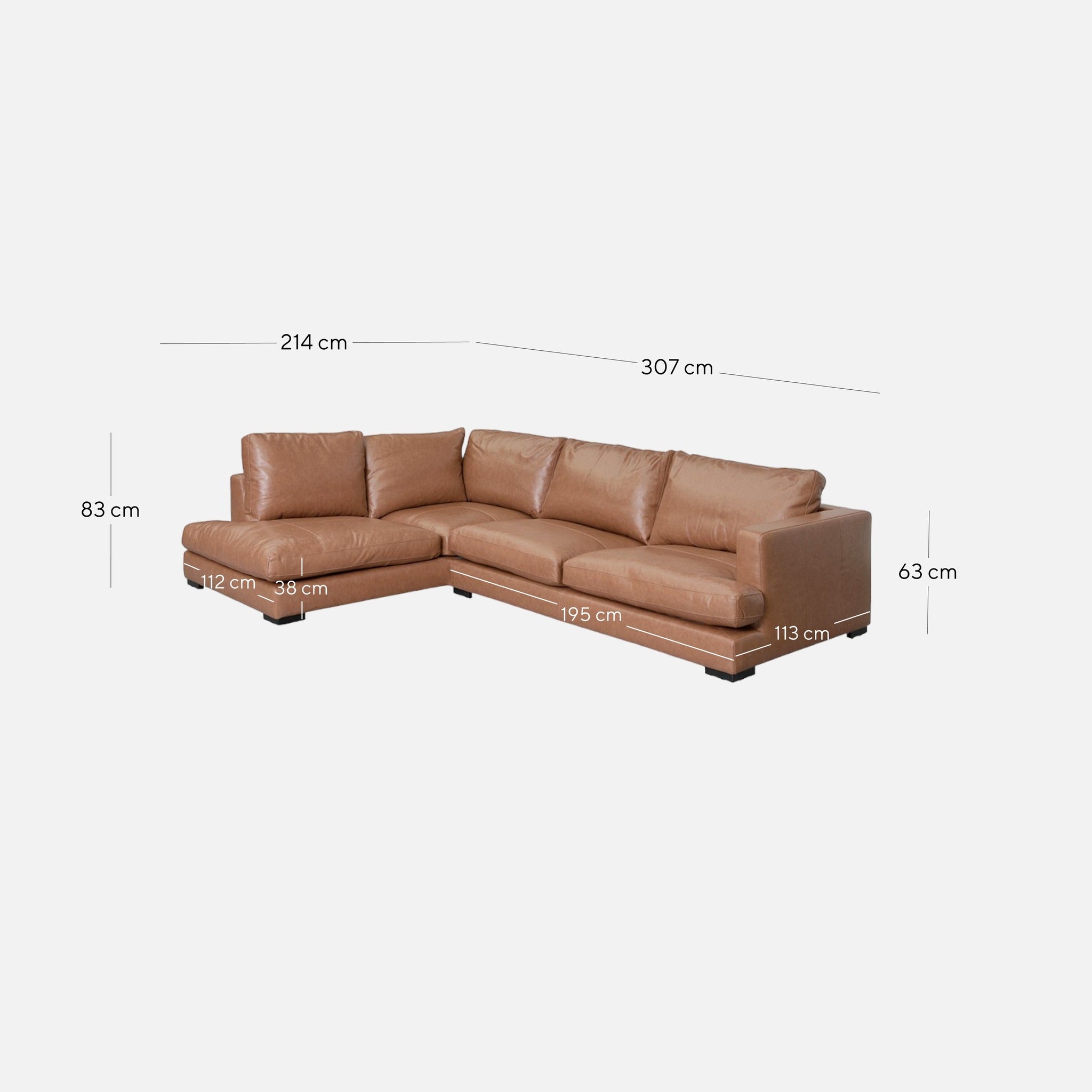 Overall: 307cm (W) x 214cm (D) x 83cm (H) Sofa: 195cm (W) x 113cm (D) x 83cm (H) Seat Height: 38cm Arm Height: 63cm Chaise: 112cm (W) x 214cm (D) x 83cm (H) Seat Height: 38cm