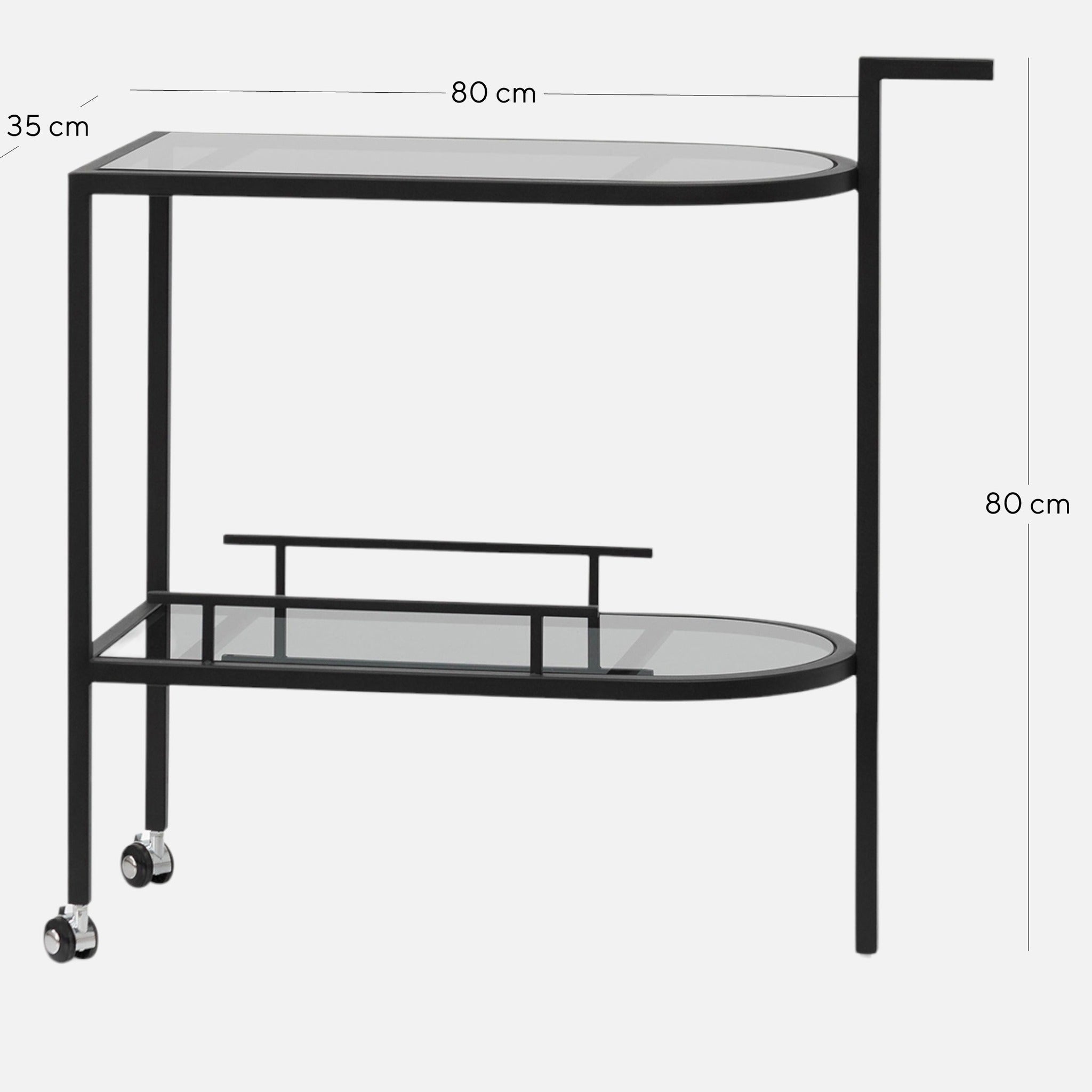 Elegant, minimal, and modern with 2 semi-oval-shaped shelves combined black metal frame, Luigi Glass Bar Cart - Black is a great choice for your kitchen, dining room, or outside activities. Luigi offers spacious storage and easily move around with one simple handle and two locking wheels.
