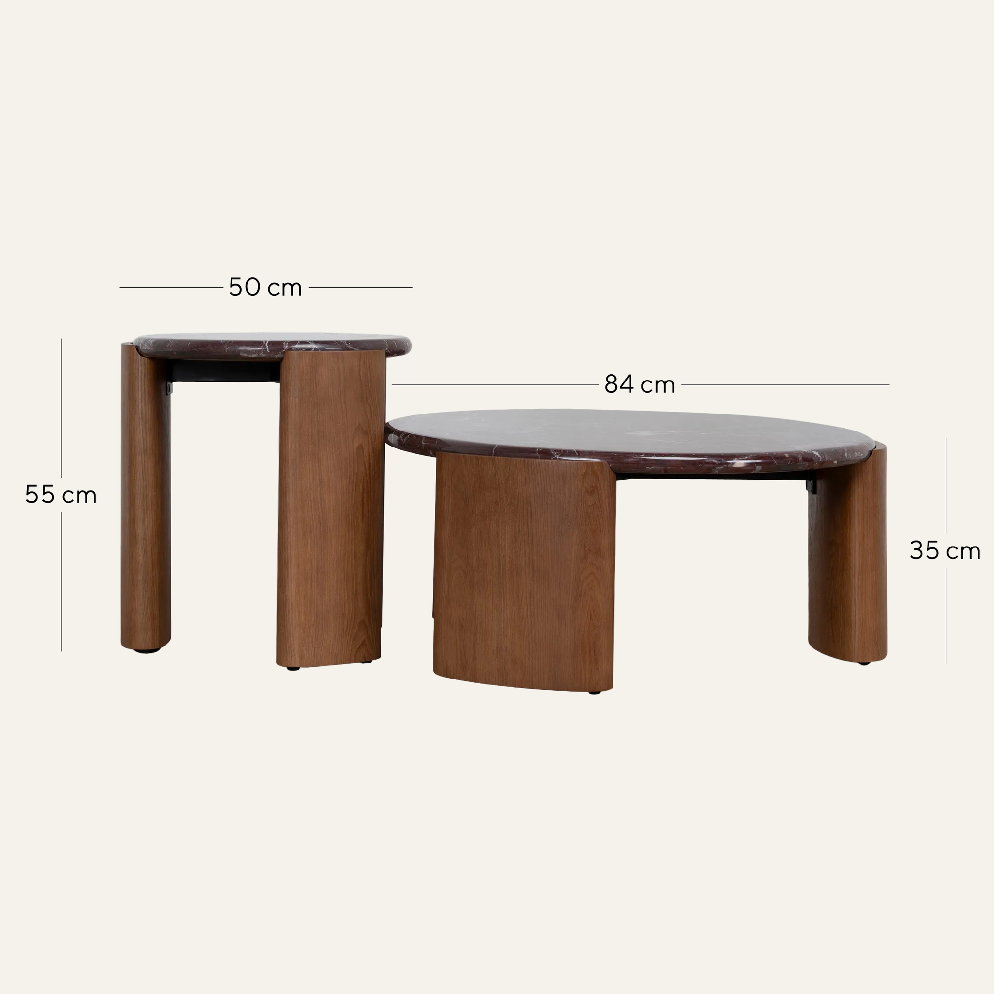 Bringing together sculptural form and rich natural expression, The Marbela Nested Rosso Levanto Marble Coffee Table in Walnut features deep burgundy surfaces traced with striking white veining, making each piece visually distinctive.