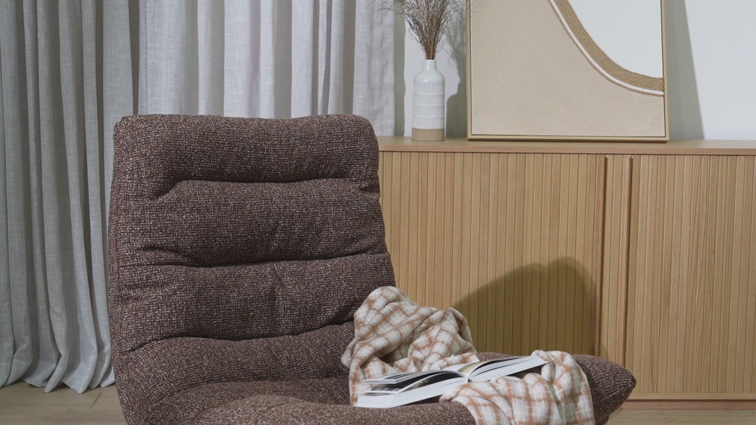 A low, relaxed profile defines the Marenzo Black Lounge Chair in Verona Cinnamon Weave, creating an easygoing focal point for modern interiors. The woven texture introduces warmth and visual depth, while the plush cushioning enhances its inviting, sink-in feel.