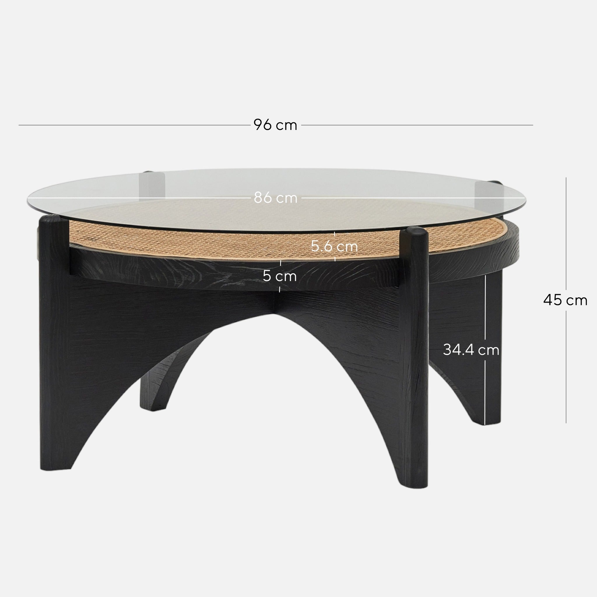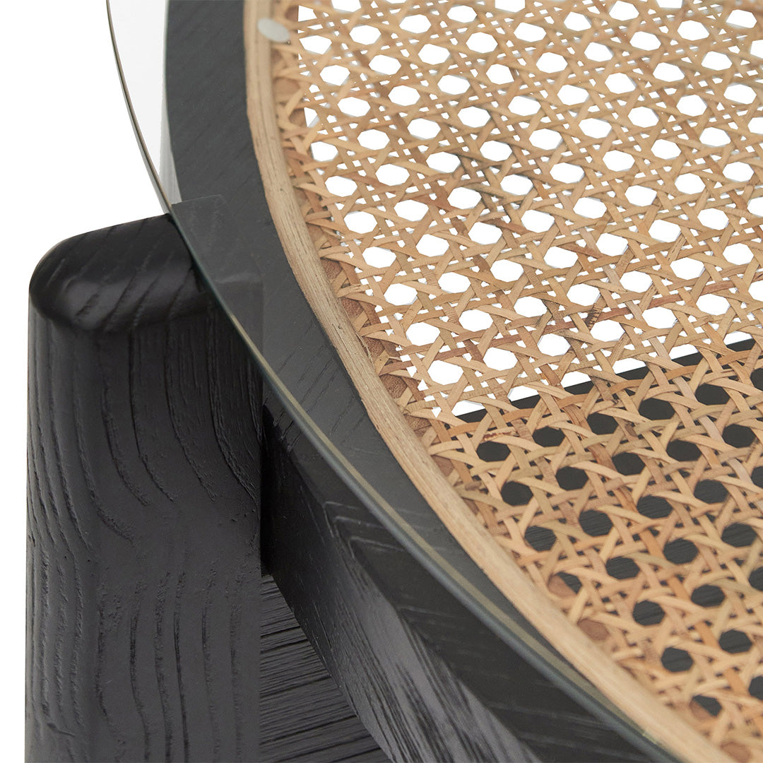 Crafted with meticulous attention to detail, this coffee table captures the essence of rattan furniture, renowned for its timeless appeal and natural aesthetic, and blends it into a contemporary and sophisticated statement piece for your living space. The tempered glass top with striking black legs creates a bold, yet airy feel; a perfect new home for your favorite magazines or decorative accents.