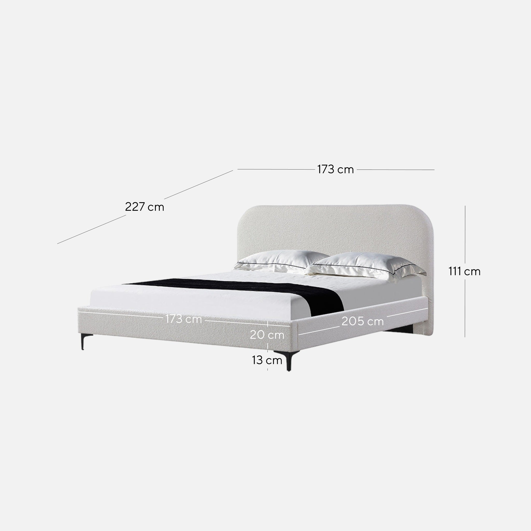 Overall: 173cm (W) x 227cm (D) x 111cm (H) Bedhead: 173cm (W) x 14cm (D) x 111cm (H) Sideboard: 205cm (W) x 6cm (D) x 20cm (H) Footboard: 173cm (W) x 8cm (D) x 20cm (H) Leg Height: 13cm