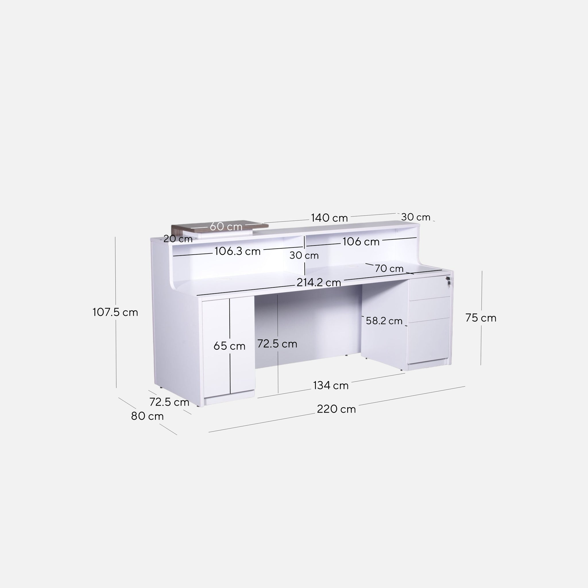 Introducing the Metro Reception Counter! With a sleek white and natural finish, this desk features a built-in 3-drawer pedestal, CPU and storage cupboard, and chrome cable covers for a clutter-free workspace. The Urban offers a minimalist yet highly functional design, while also providing a 5 year warranty for added durability and peace of mind.