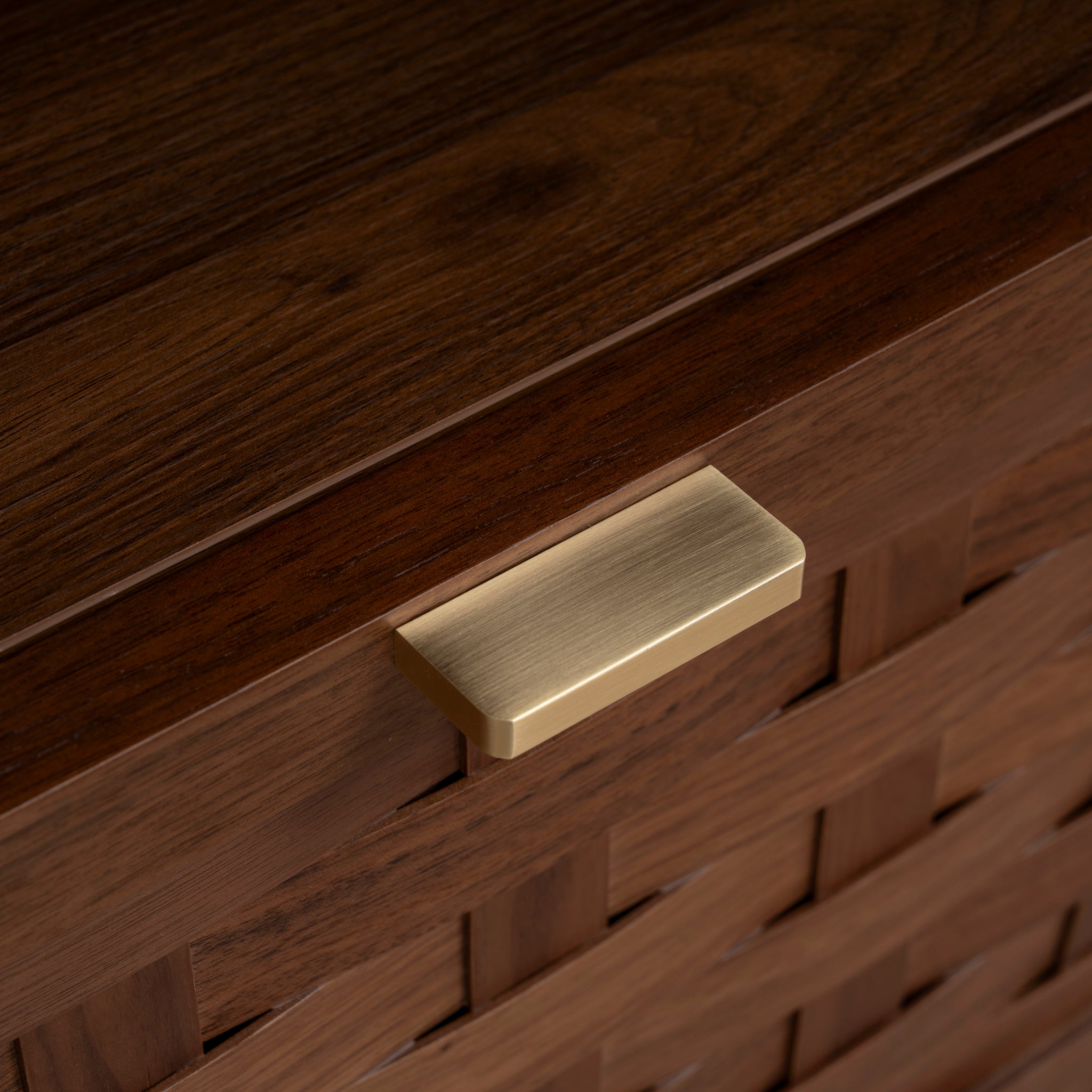 - Intricate basket-weave drawer fronts add texture and artisanal character