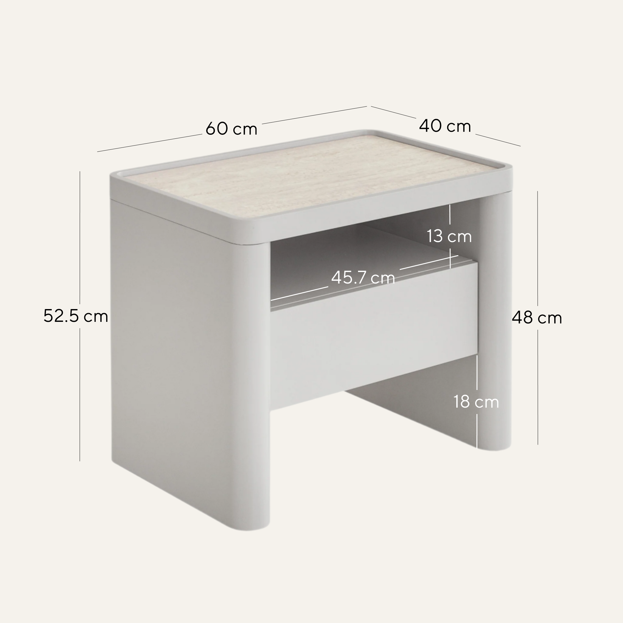 Overall: 60cm (W) x 40cm (D) x 52.5cm (H) Internal Drawer: 40cm (W) x 27cm (D) x 10cm (H) Shelf: 45.7cm (W) x 32.5cm (D) x 13cm (H) Table Thickness: 4cm Leg Height: 48cm Base Height: 18cm