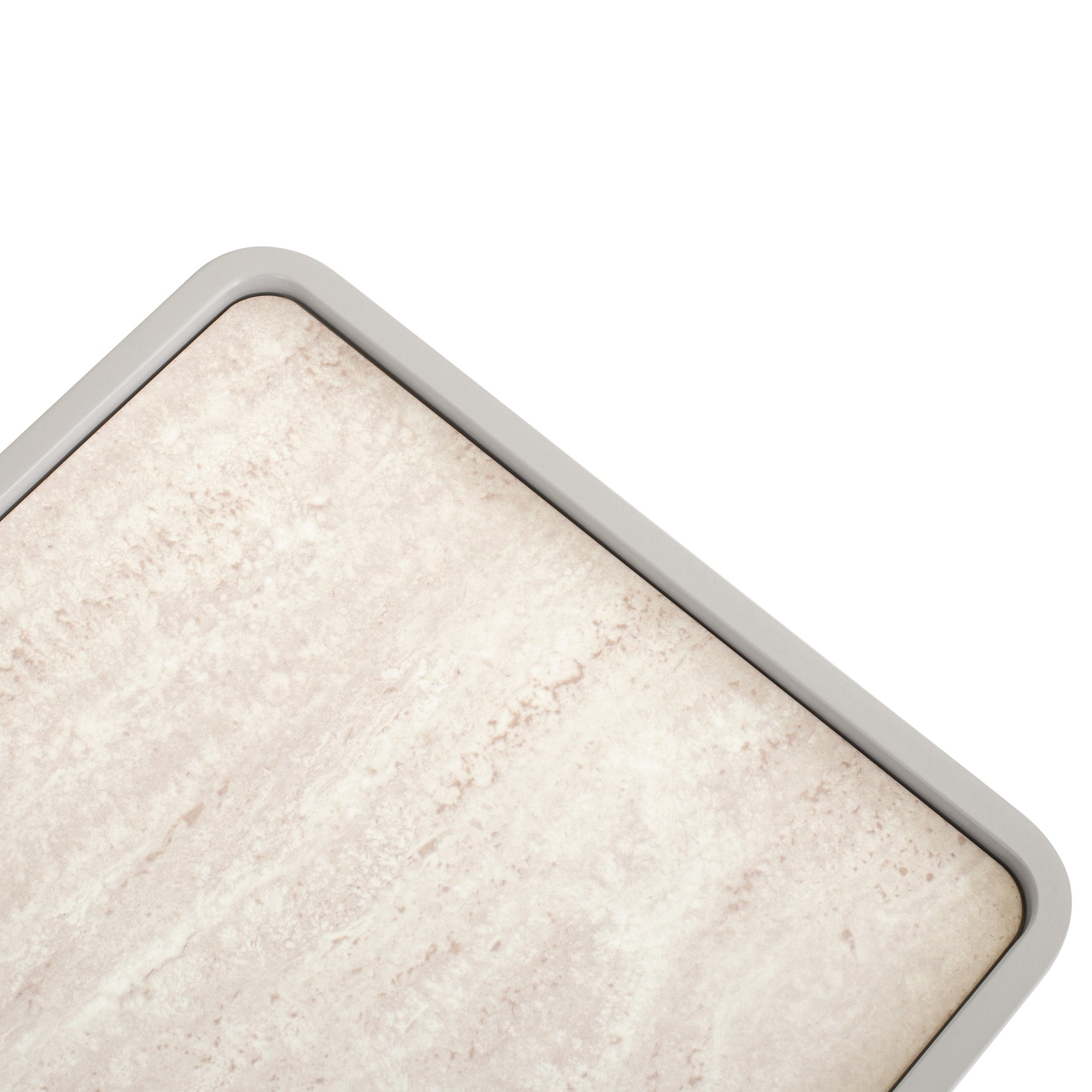 - Contrasting textures between the smooth frame and stone-look top