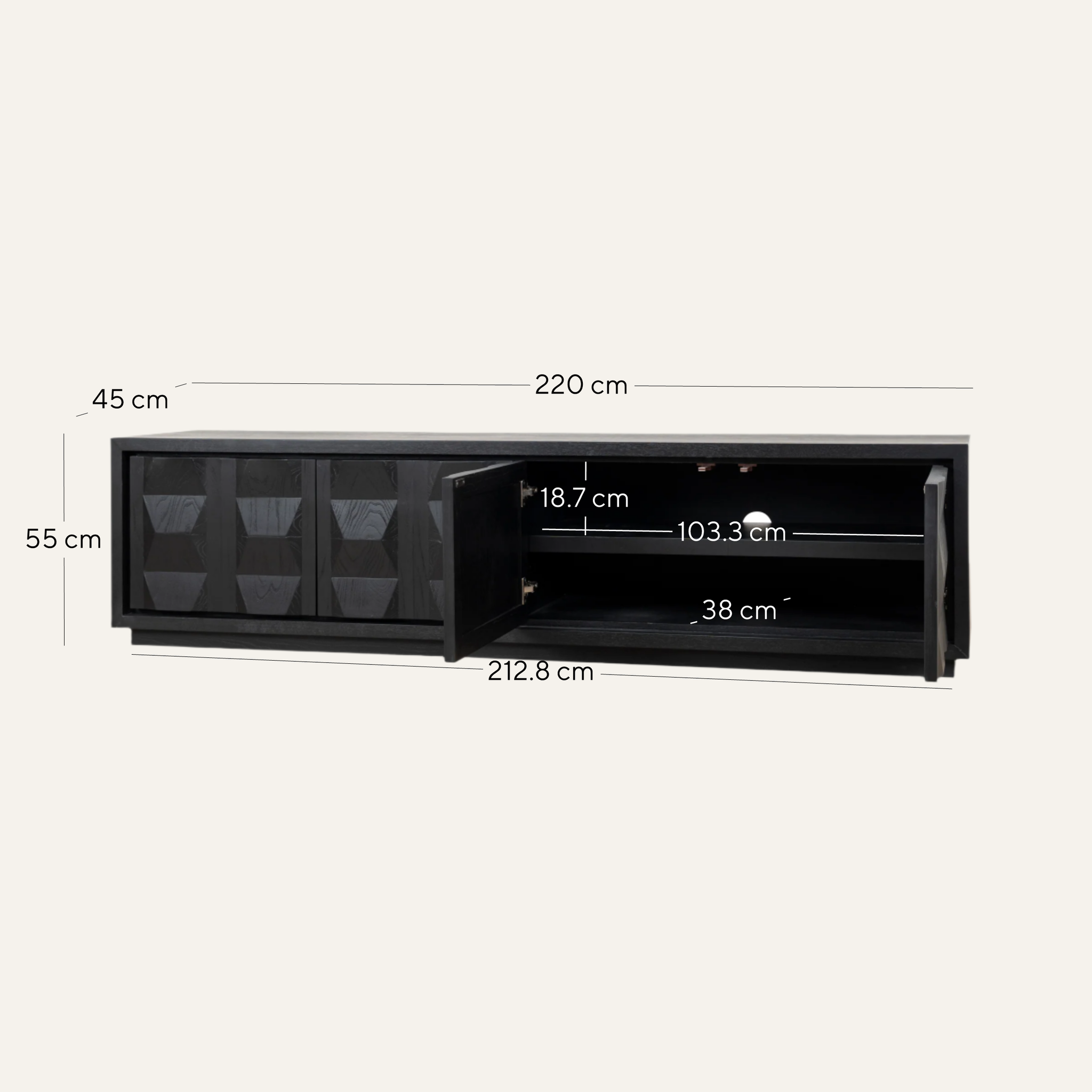 Monolith 2.2m TV Entertainment Unit in Full Black delivers not only a striking visual presence, but also is designed for functionality with ample storage and seamless cable management through two thoughtfully placed cut-outs. Its minimalist silhouette conceals extraordinary strength, elevating your media display to new heights.