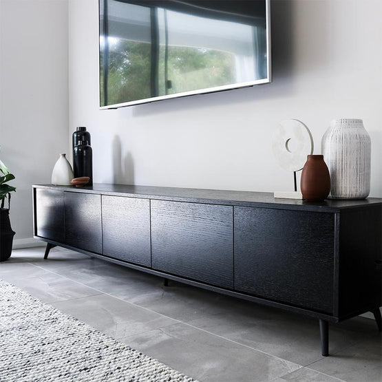 Make a modern statement with our handsome Nelson 2.4m TV Entertainment Unit - Black Oak Frame - Oak Doors. The sleek dark finish adds impressive sophistication to the overall design. With a simple silhouette and plenty of storage, this entertainment unit has it all. Elevate your decor with this modern design TV unit.