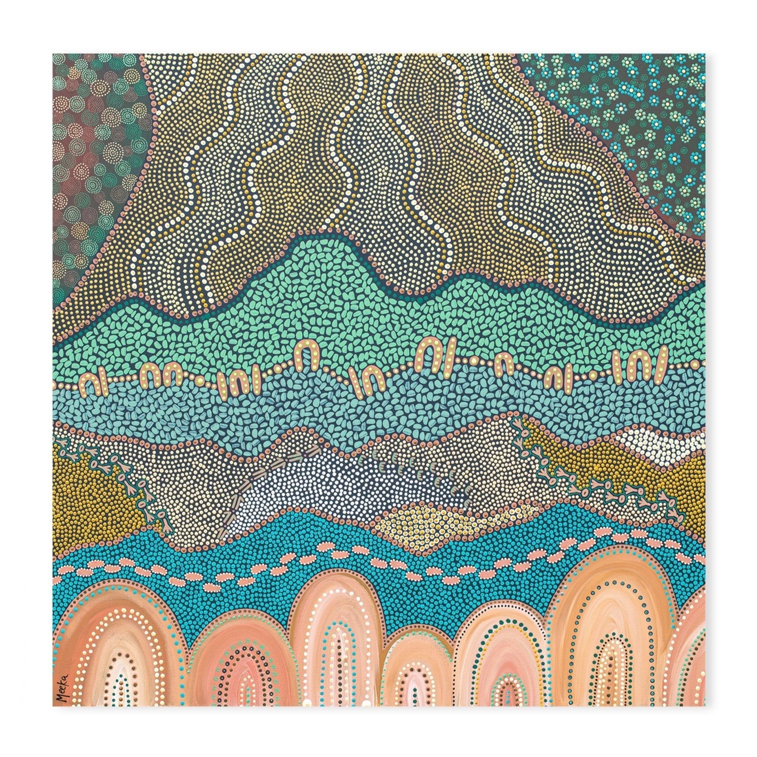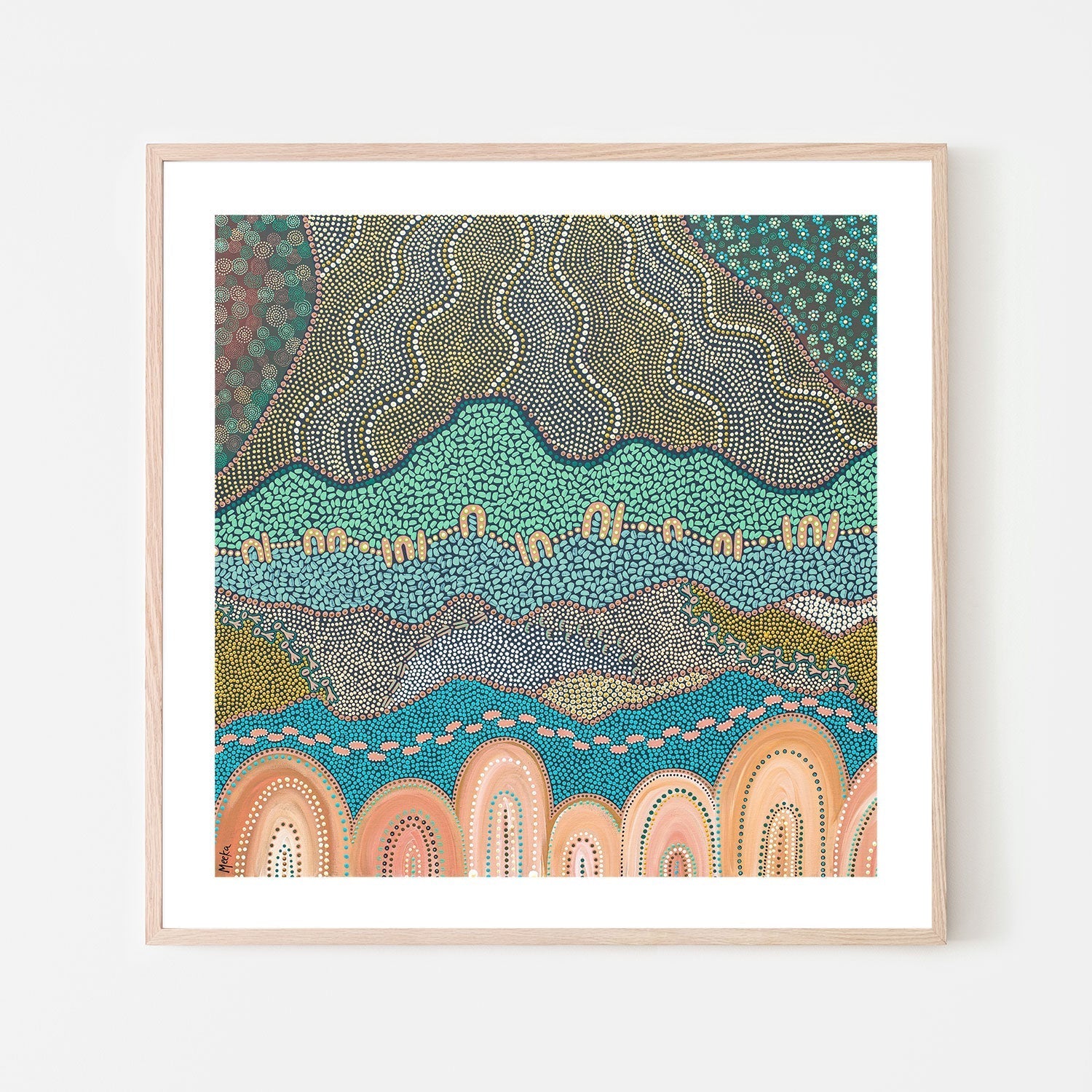 Introducing New Beginnings, a mesmerizing Indigenous-inspired artwork by Domica Hill. This stunning piece blends earthy and oceanic hues with intricate dot work and organic patterns, symbolizing growth, resilience, and connection to Country. A unique and meaningful addition to any space.