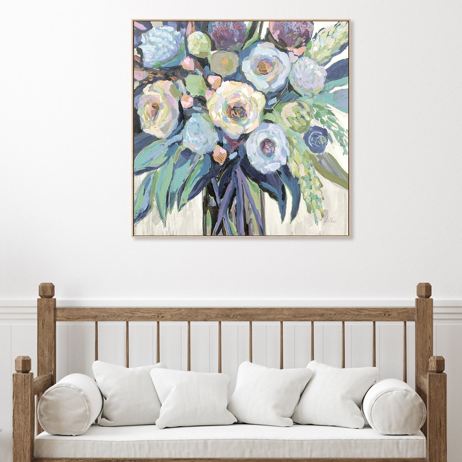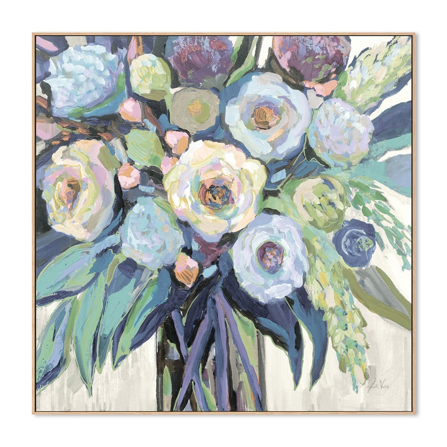 Add a pop of playful personality to your walls with "Nighttime Neutral" by Jeanette Vertentes. This vibrant bouquet is brought to life with expressive brushstrokes and lush tones, featuring deep purples, greens, and soft neutrals. A perfect addition for modern spaces in need of texture and boldness.