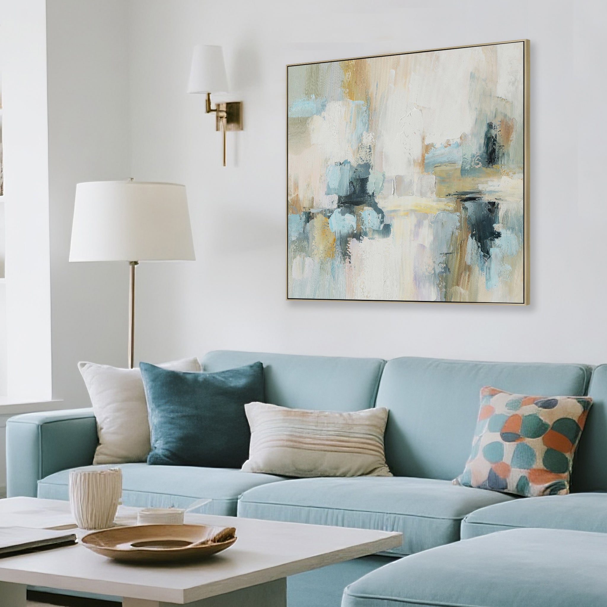 Blending muted blues, creams, and greys in an abstract landscape, Nordic Haze 80 x 80cm Framed Canvas in Natural captures quiet beauty and balance through organic brushstrokes. Its depth and texture create a refined focal point for modern, tranquil interiors.