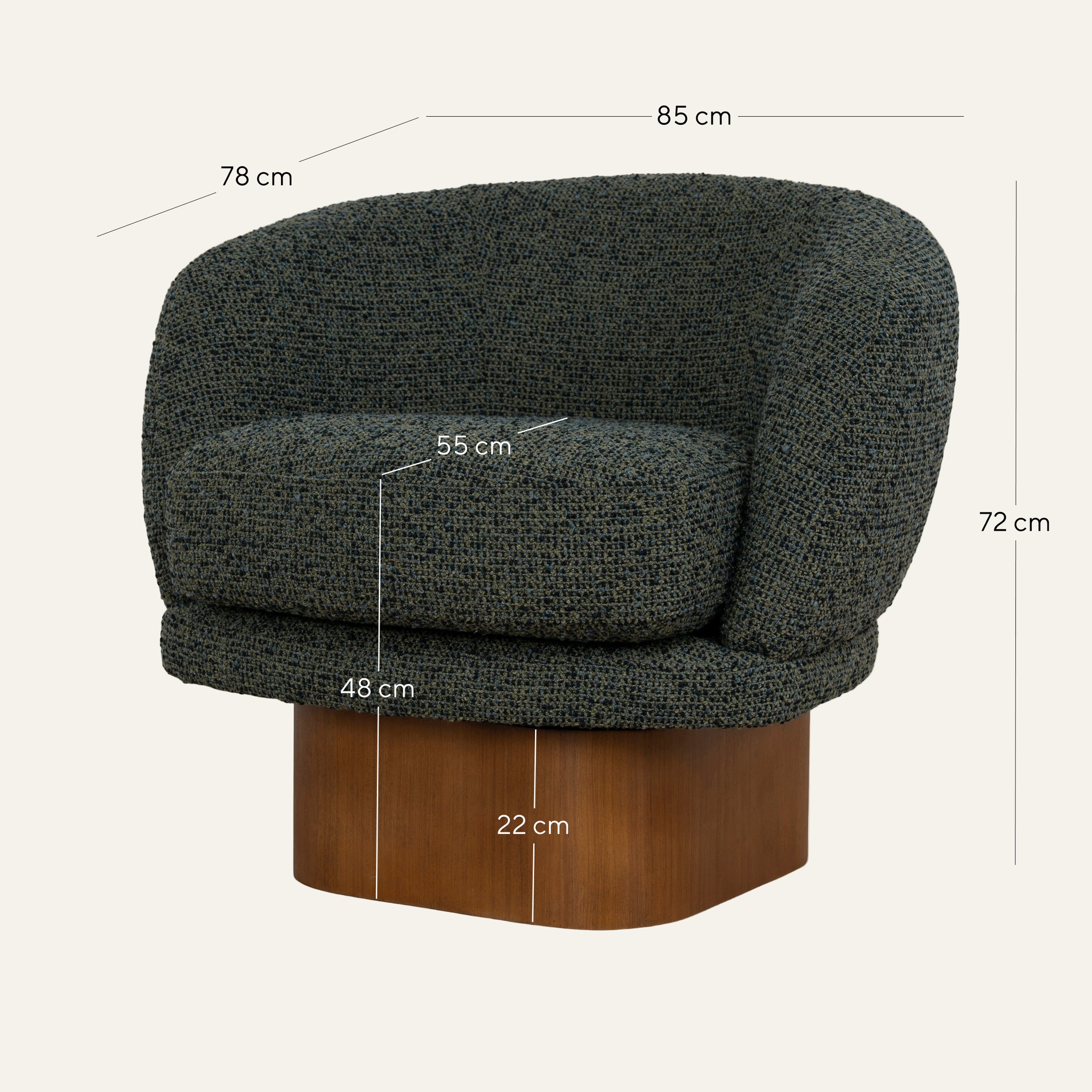 Overall: 85cm (W) x 78cm (D) x 72cm (H) Seat: 55cm (W) x 55cm (D) x 48cm (H) Arm Height: 62cm Leg Height: 22cm