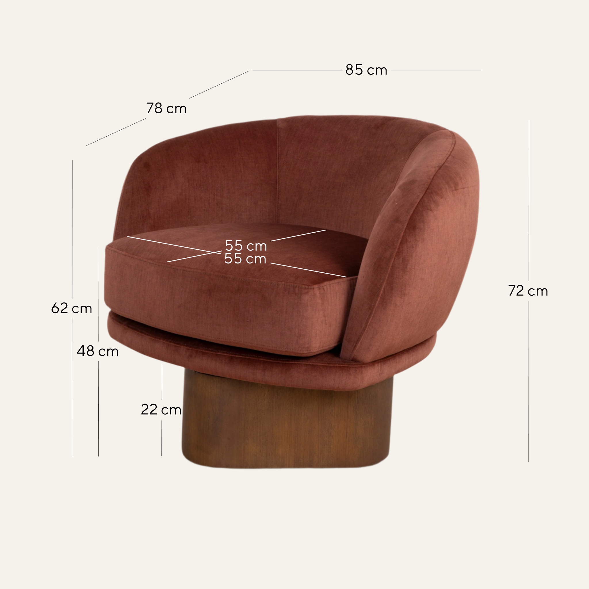 Overall: 85cm (W) x 78cm (D) x 72cm (H) Seat: 55cm (W) x 55cm (D) x 48cm (H) Arm Height: 62cm Leg Height: 22cm