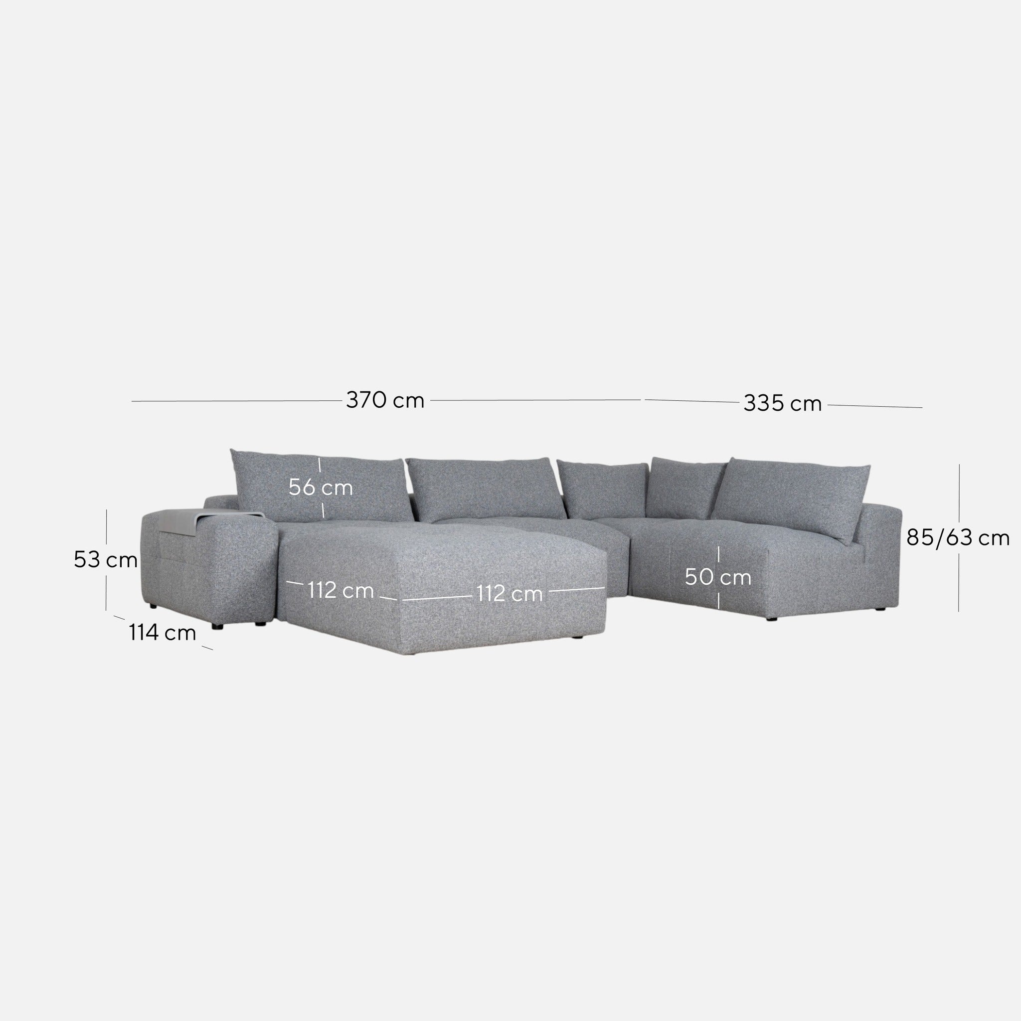 Overall: 370cm (W) x 355cm (D) x 63cm (H) Detachable Arm: 114cm (W) x 34cm (D) x 53cm (H) Each Single Sofa: 112cm (W) x 112cm (D) x 63cm (H) Corner: 111cm (D) x 111cm (D) x 63cm(H) Ottoman: 112cm (W) x 112cm (D) x 48cm (H) Seat Height: 50cm Leg Height: 3.3cm