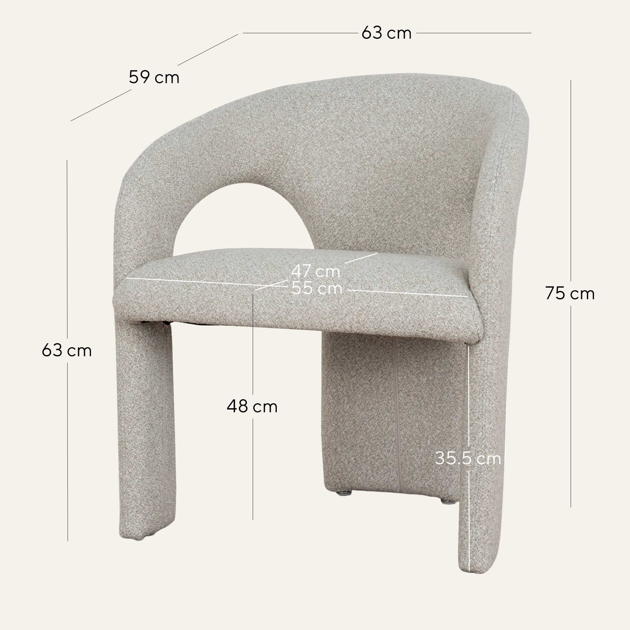 Overall: 63cm (W) x 59cm (D) x 75cm (H) Seat: 55cm (W) x 47cm (D) x 48cm (H) Arm Height: 63cm Leg Height: 35.5cm